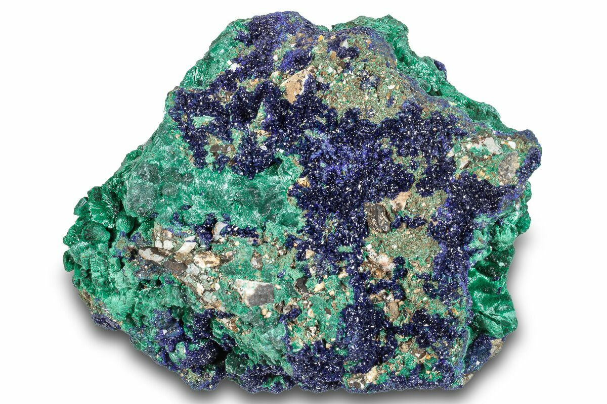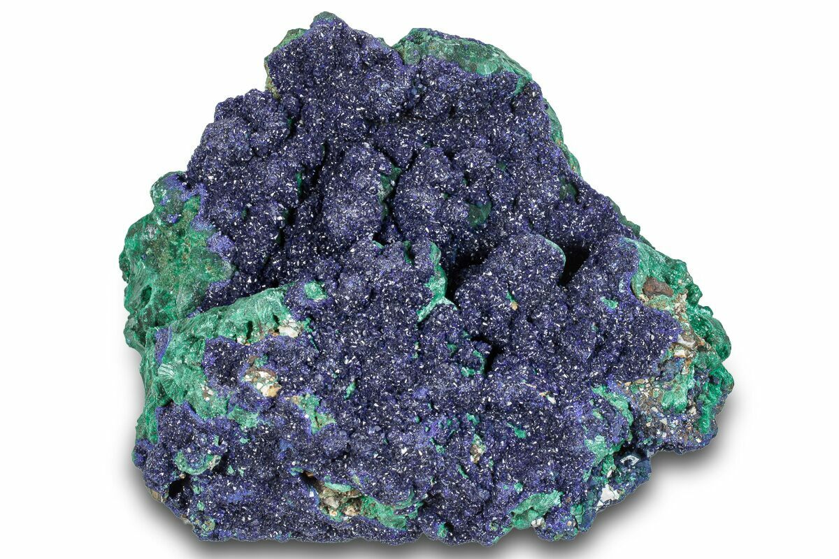 This is a beautiful, 3.5" wide association of sparkling, deep-blue azurite crystals with fibrous malachite, collected from the Liufengshan Mine in China.