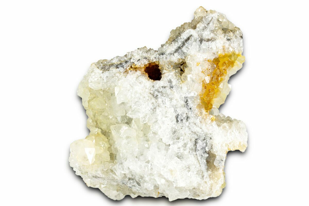 This is a new mineral find out of Turkey. It's a 3.5" wide section of matrix with pockets encrusted in natural citrine quartz crystals. The most likely location of collection is the Göynük mine in the Kütahya Province of Turkey, however we're not certain about this.