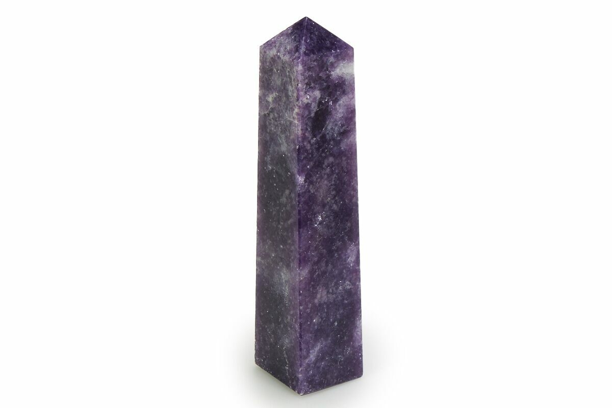 This is a 3.5" tall, polished tower crafted from richly colored, dark-purple lepidolite. Its naturally sparkly, mica-rich surface catches the light beautifully, creating a shimmering display from every angle. A striking piece with great texture and color, perfect for adding a vibrant mineral accent to any collection.