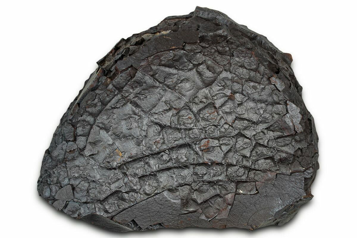 Dragon scale stone is the trade name of this type of iron nodule found in the Hell Creek Formation of North Dakota. They are found alongside dinosaur bones throughout the Hell Creek deposits, often lying next to dinosaur remains. Despite their name, these stones have nothing to do with dragons aside from their unique polygonal patterning, reminiscent of dragon scales. Their composition is primarily iron oxide with a siderite core and manganese/iron oxides that give them their dark red-brown patina.