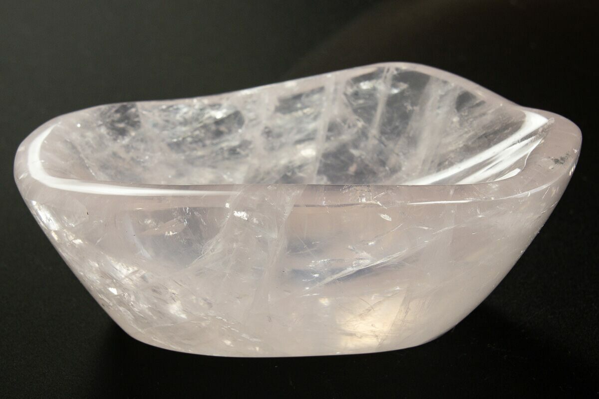 This is a gorgeous, 3.55" wide, polished rose quartz bowl/dish. It has been hand carved/polished out of a solid piece of rose quartz crystal.