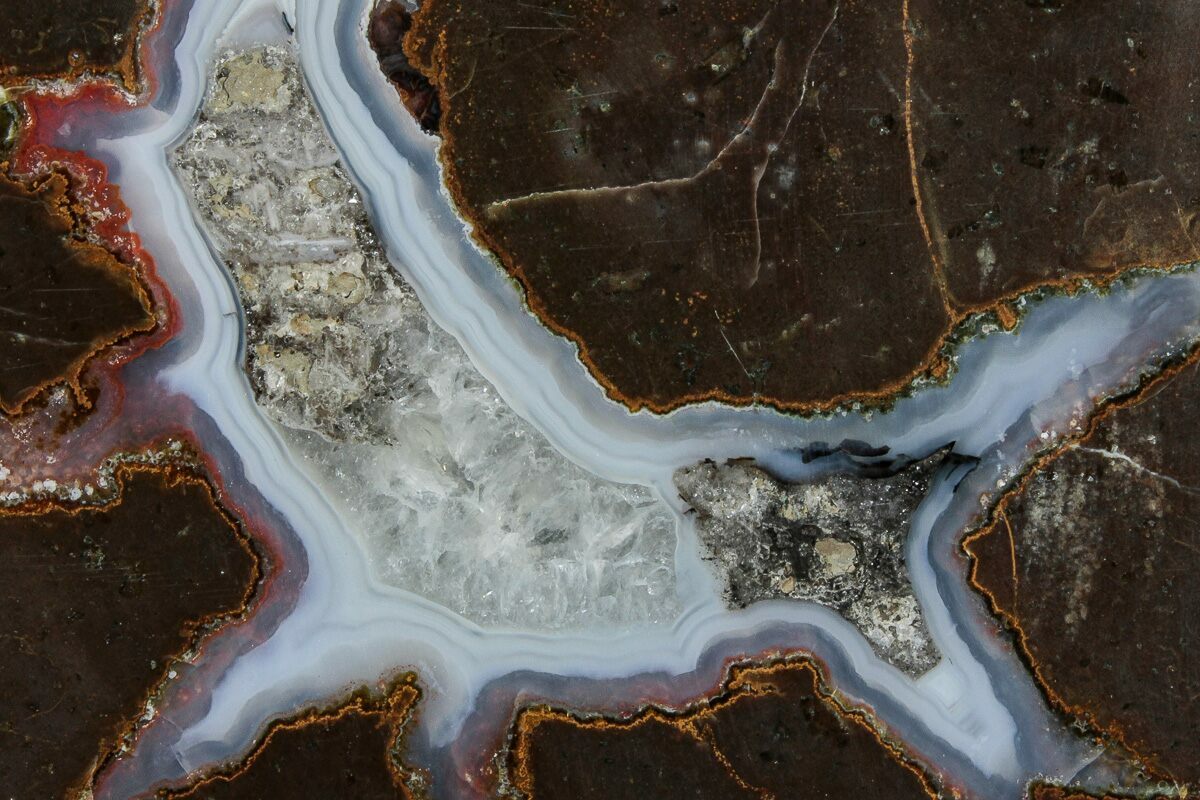 This is a gorgeous thunderegg half, collected from 79 Bed near McDermitt, Nevada. This unique specimen features a core which is filled with white to light blue chalcedony.