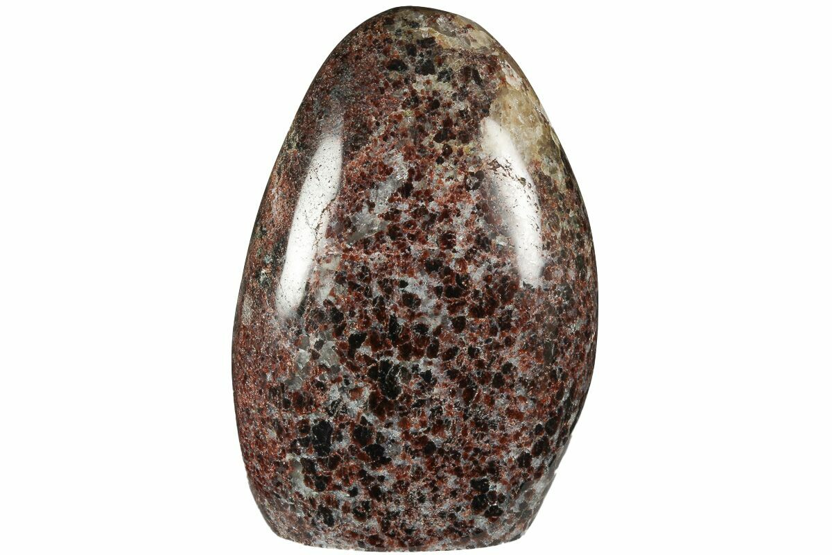 This is a 3.6" tall, free-standing section of garnetite. The base of the specimen has been cut flat for presentation and the entire specimen is polished to a glossy finish.