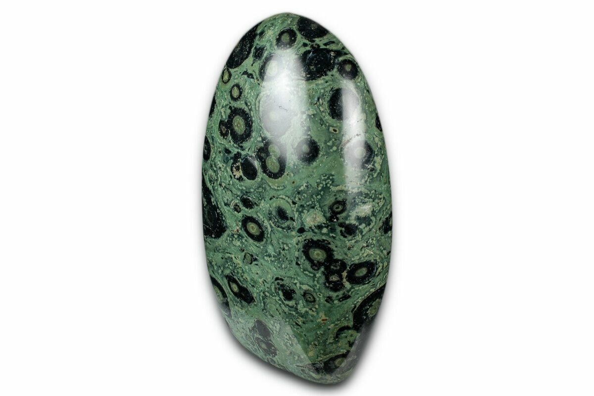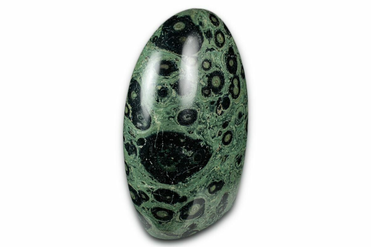 This is a 3.6" tall, polished piece of Kambaba Jasper from Madagascar, shaped so the base sits flat for effortless display on any surface. The stone features the distinctive deep green and black orbicular patterns. A striking addition to any mineral collection or décor setting, it stands beautifully on its own as a natural work of art.