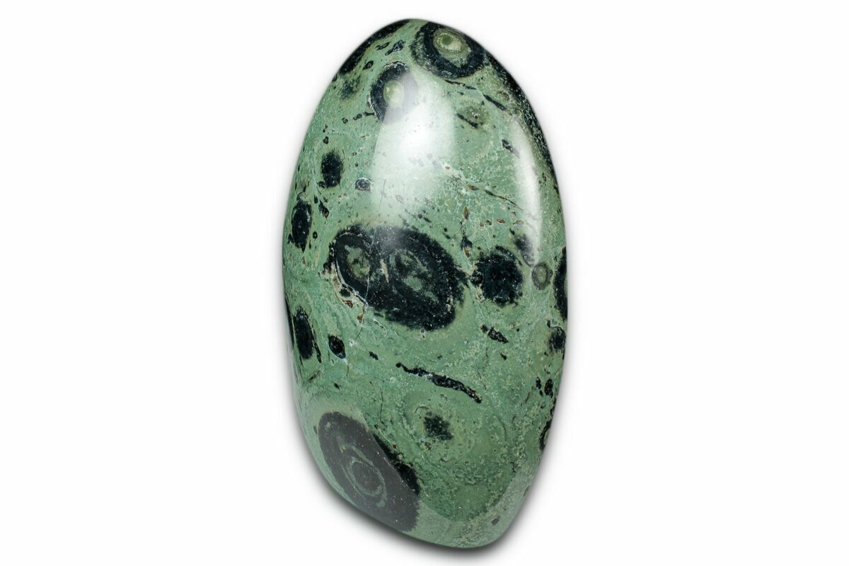 This is a 3.6" tall, polished piece of Kambaba Jasper from Madagascar, shaped so the base sits flat for effortless display on any surface. The stone features the distinctive deep green and black orbicular patterns. A striking addition to any mineral collection or décor setting, it stands beautifully on its own as a natural work of art.
