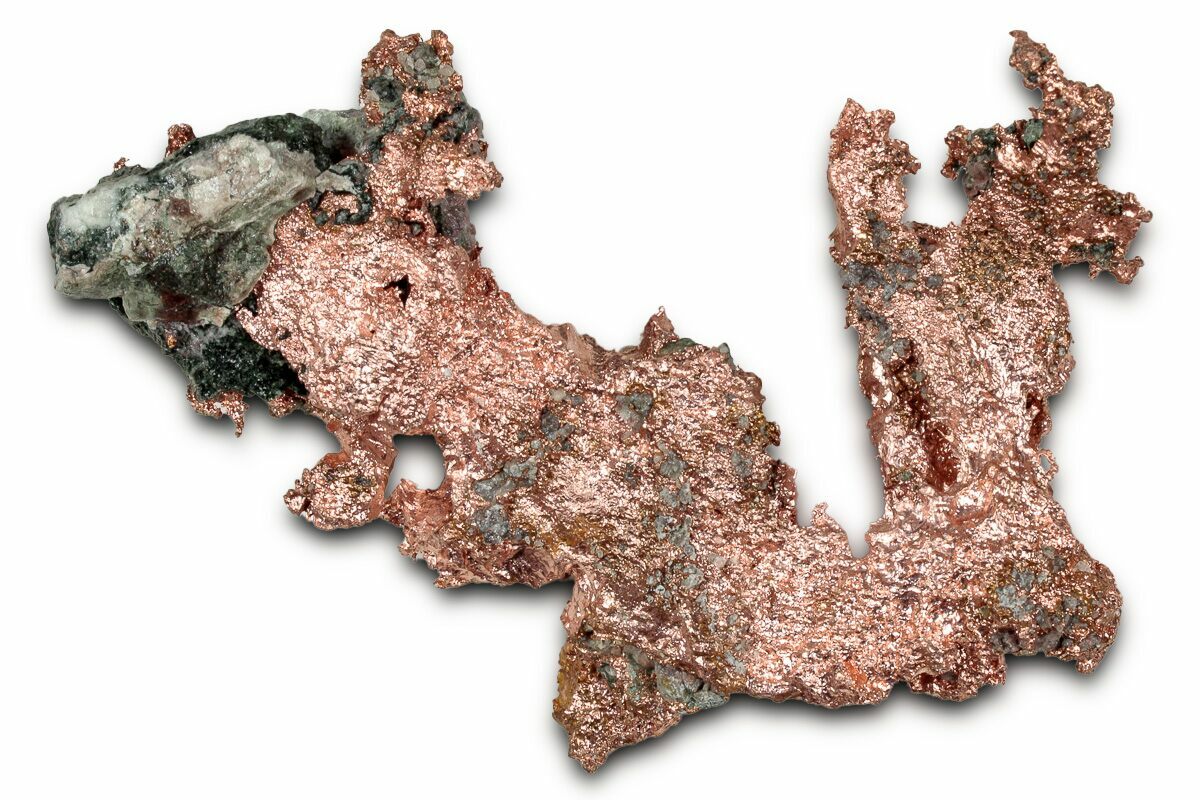 Native copper occurs rarely as isometric cubic and octahedral crystals, but more typically as irregular masses and fracture fillings. It has a reddish, orangish, and/or brownish color on fresh surfaces, but typically is weathered and coated with a green tarnish of copper carbonate.