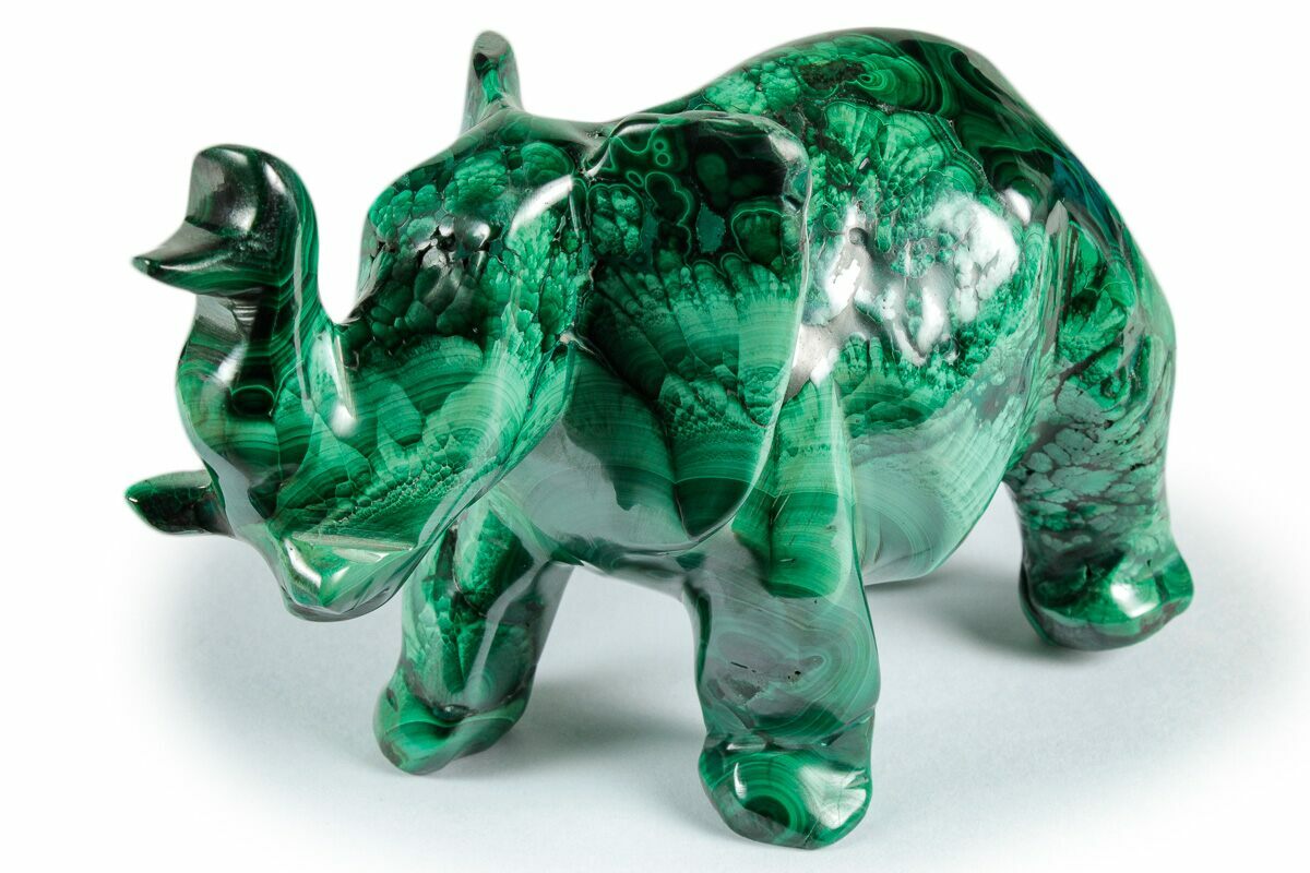 Trumpeting out of the grassland and into your home is this exquisitely carved malachite elephant from the Democratic Republic of the Congo. This is a sturdy piece that highlights the beauty of malachite with a nice, even polish. From rough mineral to polished piece, the malachite was worked by an expert craftsman to produce a seamless statue pachyderm ready for display on the shelf or in the office.