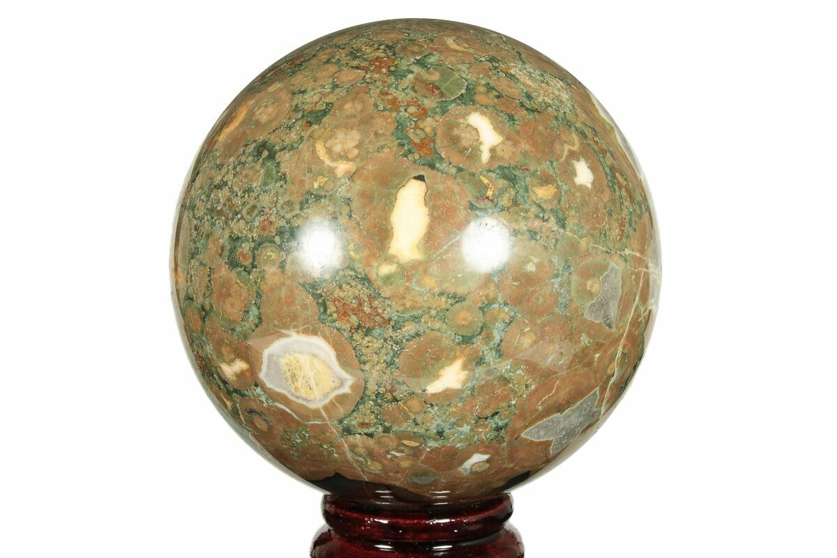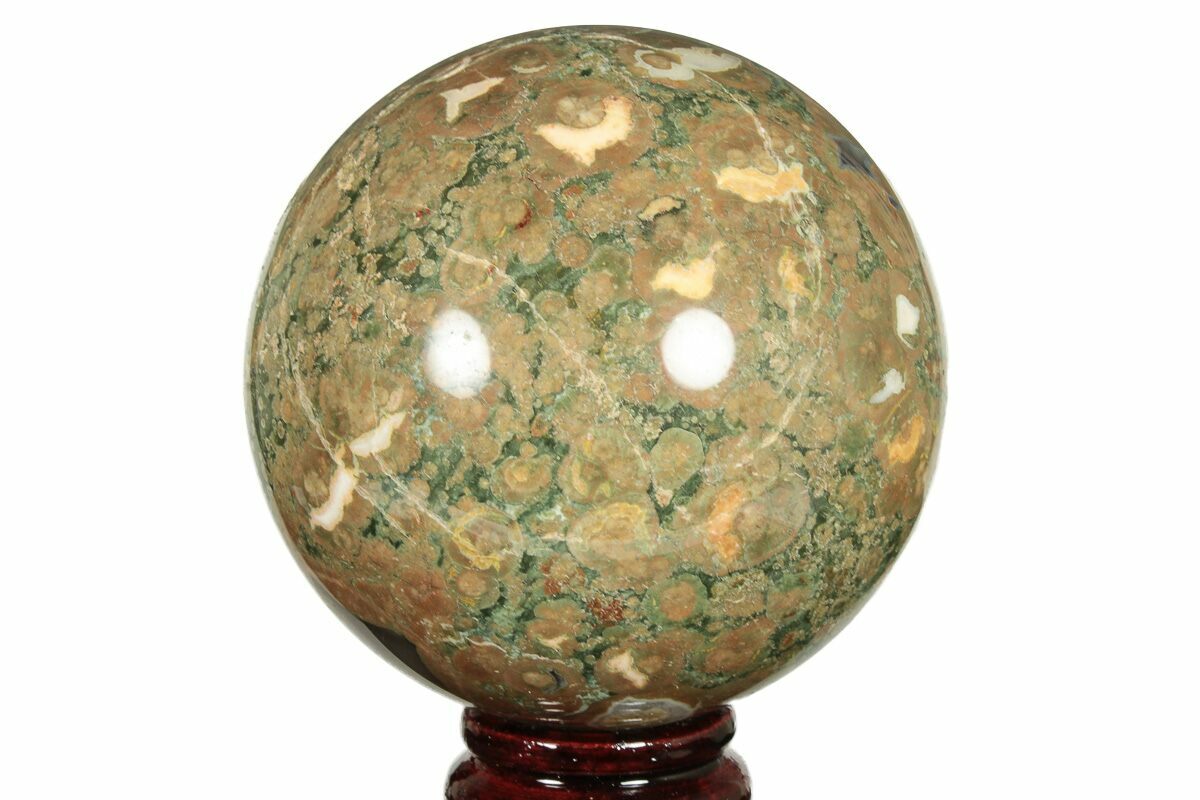 This is a 3.6" wide polished Spherulitic Rhyolite sphere, collected from Mt. Hay, Queensland. Rhyolite (Rainforest Jasper) is group of extrusive igneous rocks, typically consisting of large-grained crystals such as feldspar or quartz dispersed in a fine-grained silicate rich rock. This type of rhyolite features pockets of agate.