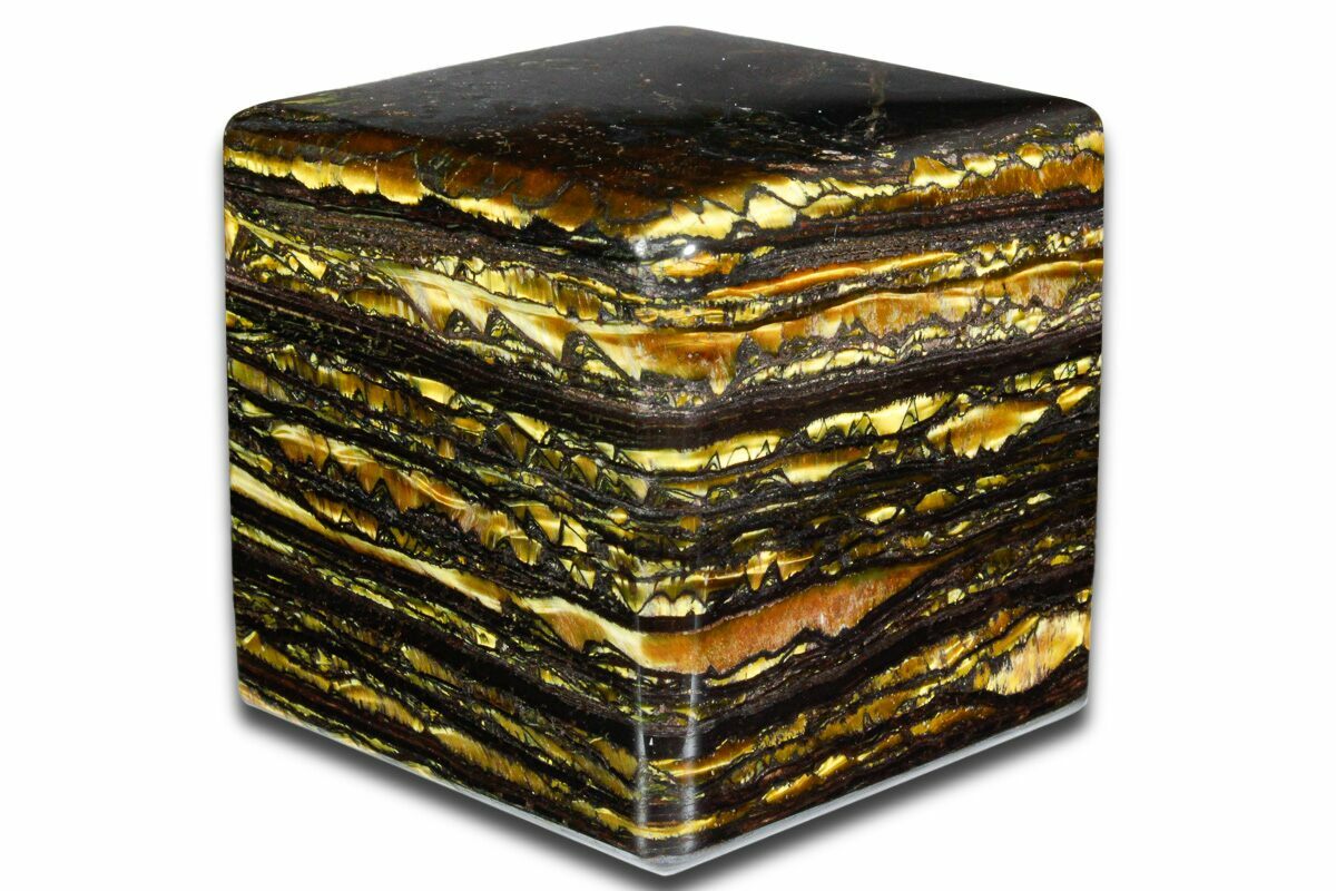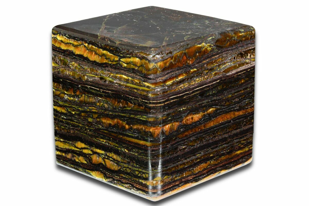 This is an amazing, high-quality, 2.35" wide polished cube of 3.02 billion year old tiger iron, collected from the Ord Ranges in Western Australia.