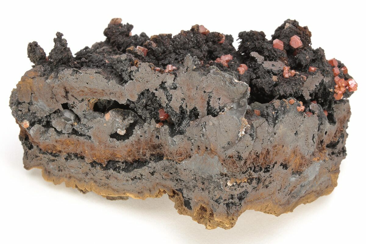 This specimen contains lustrous red Vanadinite crystals, naturally displayed on an iron-manganese oxide matrix. Both iron rich, and manganese rich matrix' can be seen on opposite sides of this specimen.