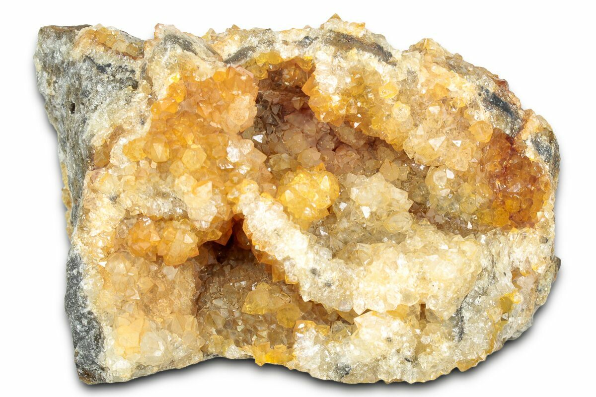 This is a new mineral find out of Turkey. It's a 3.6" wide section of matrix with pockets encrusted in natural citrine quartz crystals. The most likely location of collection is the Göynük mine in the Kütahya Province of Turkey, however we're not certain about this.
