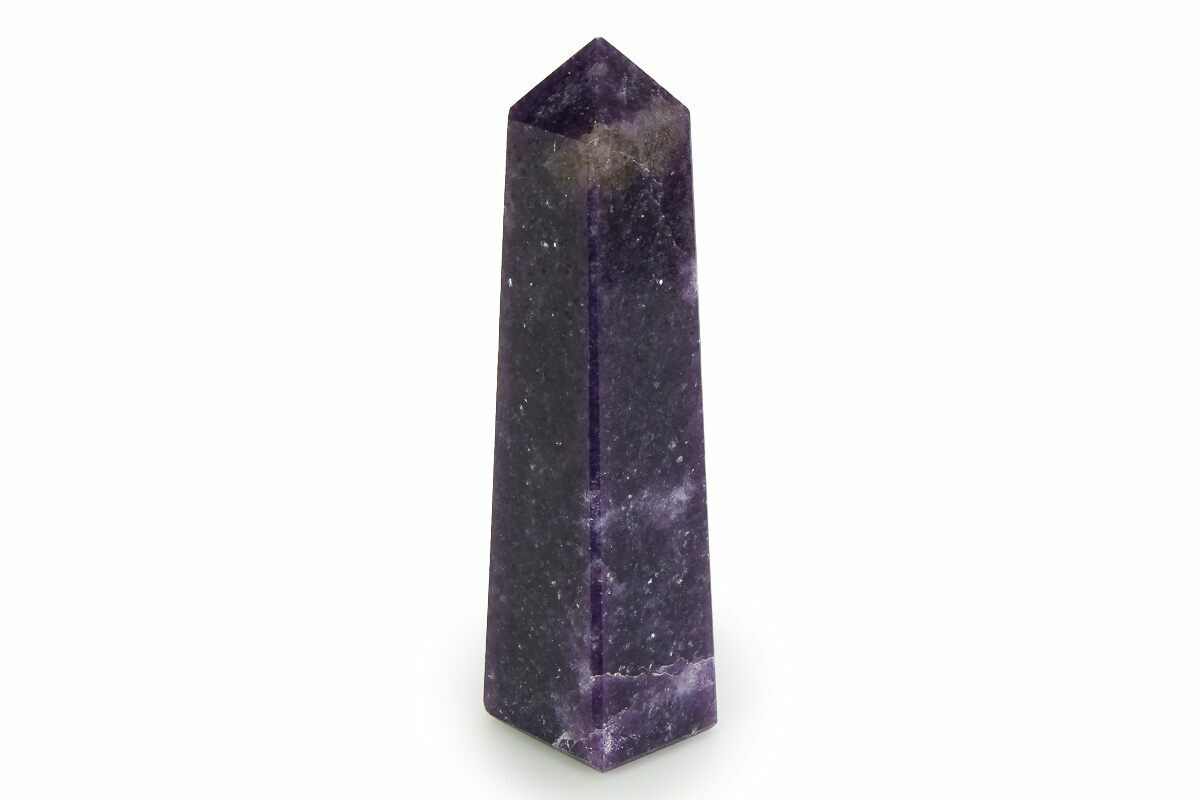 This is a 3.6" tall, polished tower crafted from richly colored, dark-purple lepidolite. Its naturally sparkly, mica-rich surface catches the light beautifully, creating a shimmering display from every angle. A striking piece with great texture and color, perfect for adding a vibrant mineral accent to any collection.