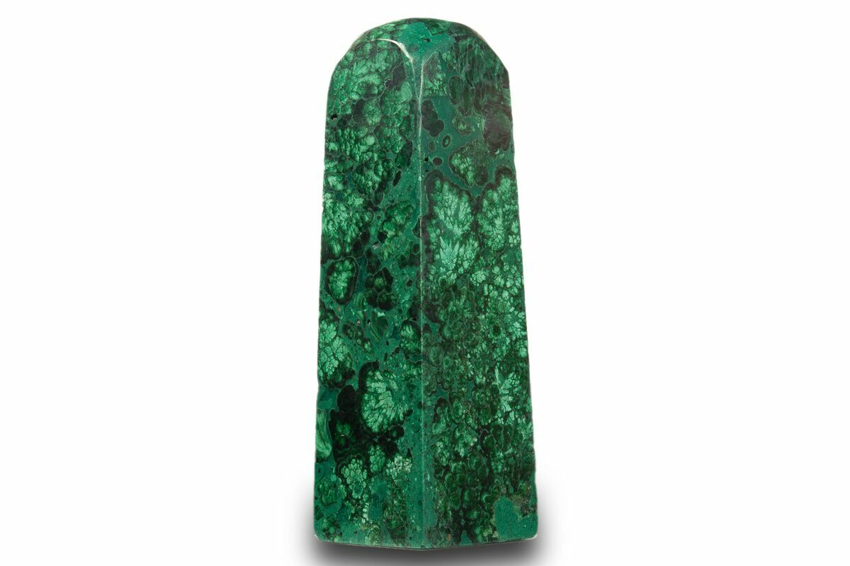 This is a beautiful, 3.6" tall polished malachite tower. The lapidary and craft work is very nice, and allows for the beautiful flowery and swirling patterns in the stone to be shown.