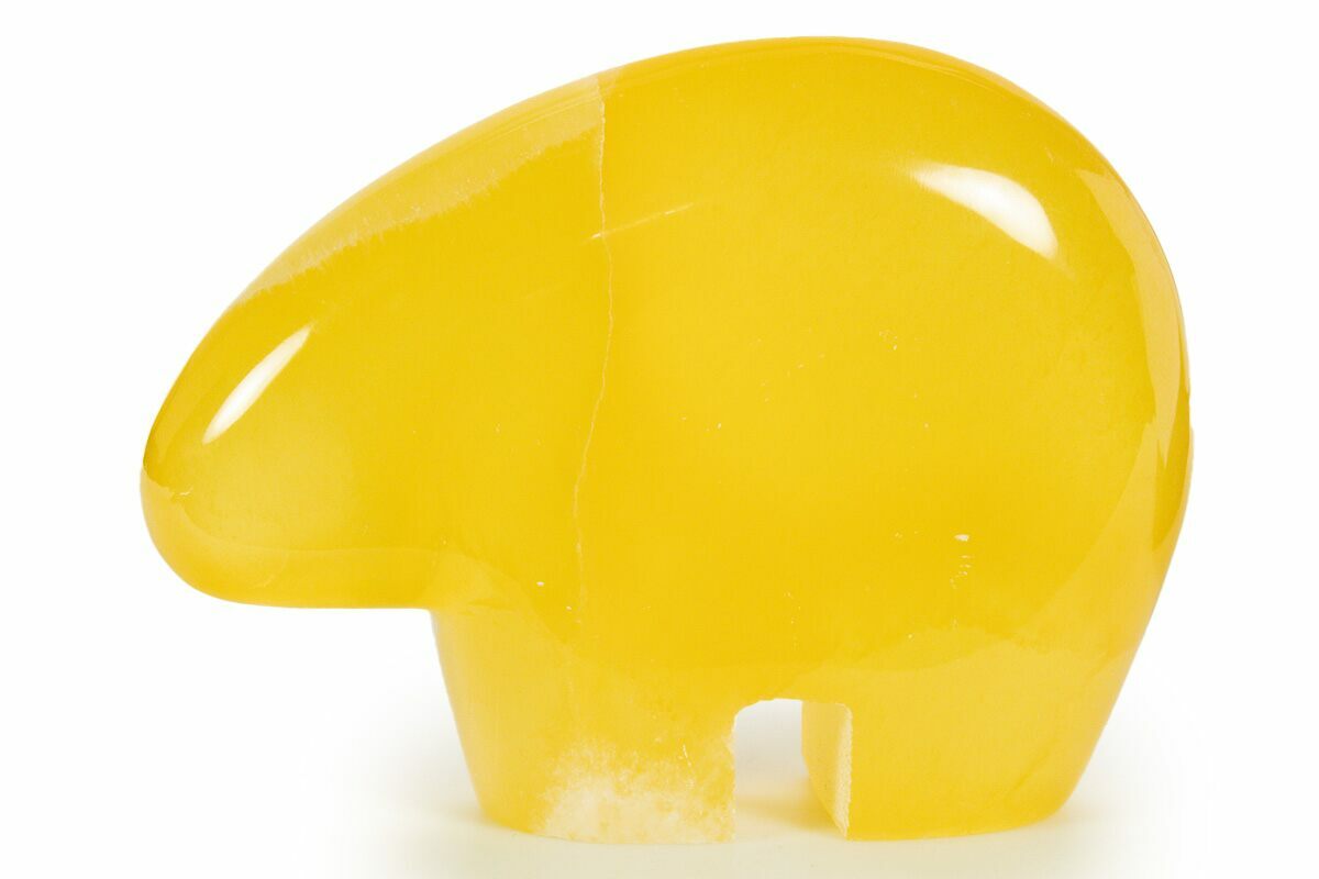 This is a 3.65" wide piece of calcite mined in Utah that has been polished into an abstract bear shape. The calcite varies in color between orange and white, with the white streaks giving it a honeycomb appearance when viewed from certain angles. The entire specimen has been polished to a glossy finish.