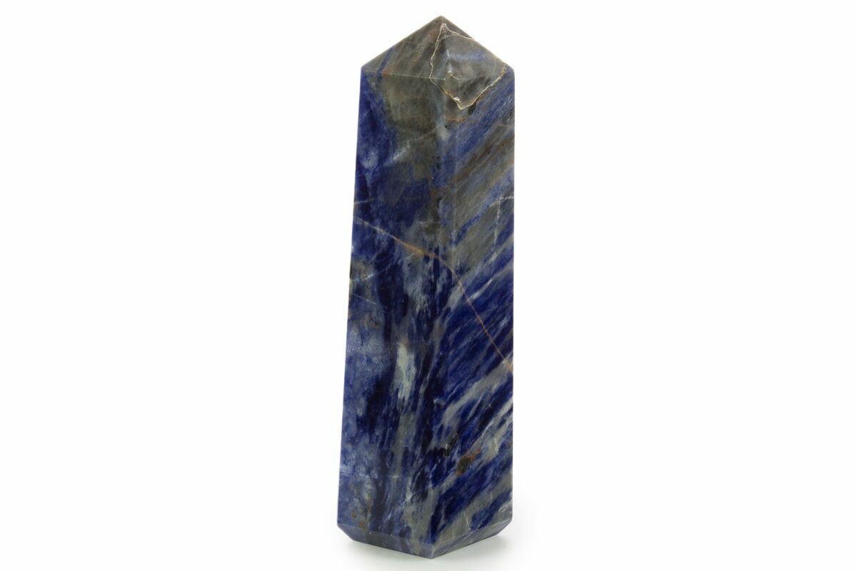 This is a 3.7" tall polished sodalite tower from Namibia. It displays the classic deep-blue coloration that sodalite is known for, streaked with contrasting veins of white and subtle hints of gray. The polish brings out its natural luster, making the swirling patterns especially vivid under light.