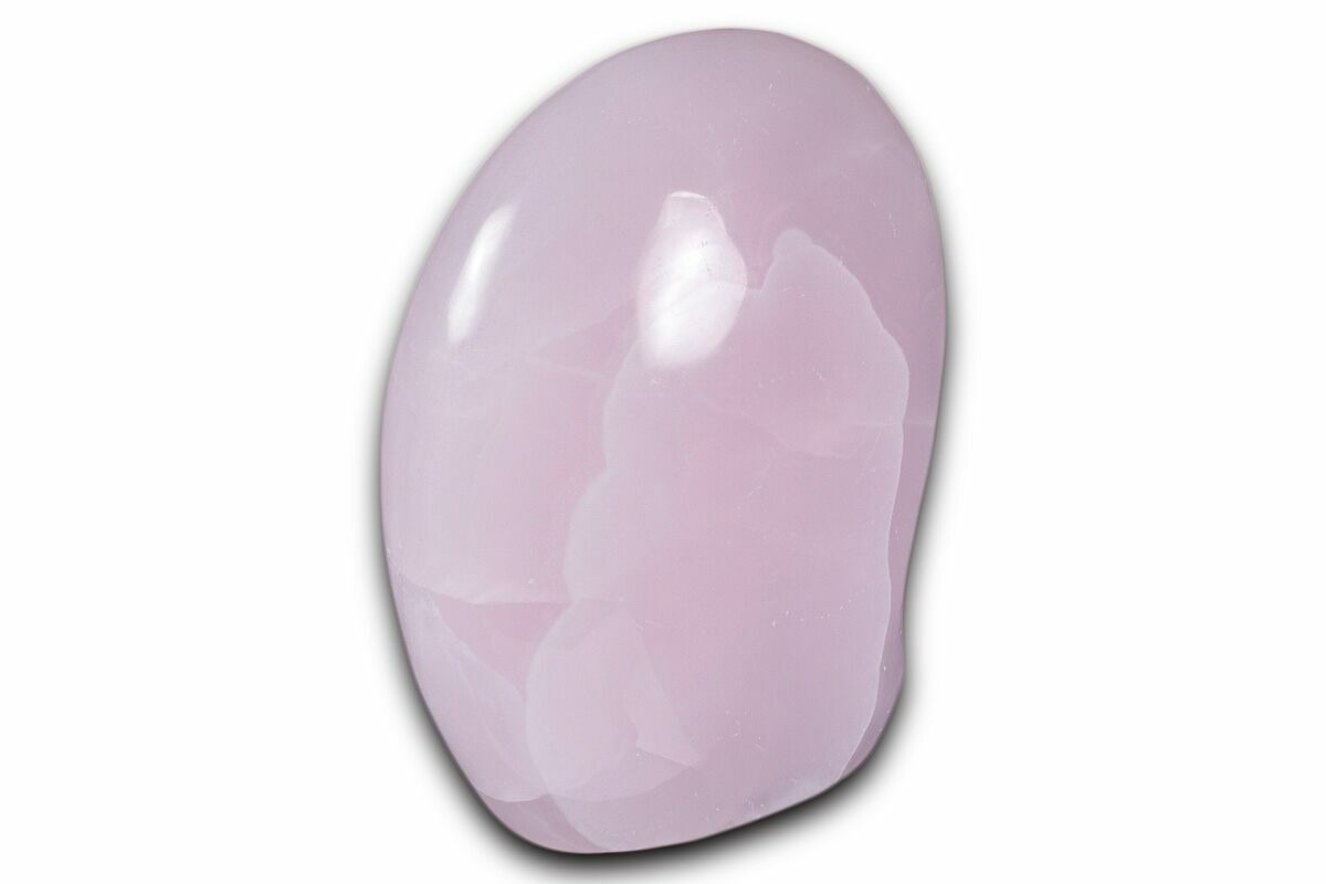 This is a gorgeous pink, 3.7" tall polished manganoan (mangano) calcite specimen. It has been expertly polished to a glossy finish all the way around, highlighting the natural banding of the mineral, and the base of the specimen has been cut flat for presentation.