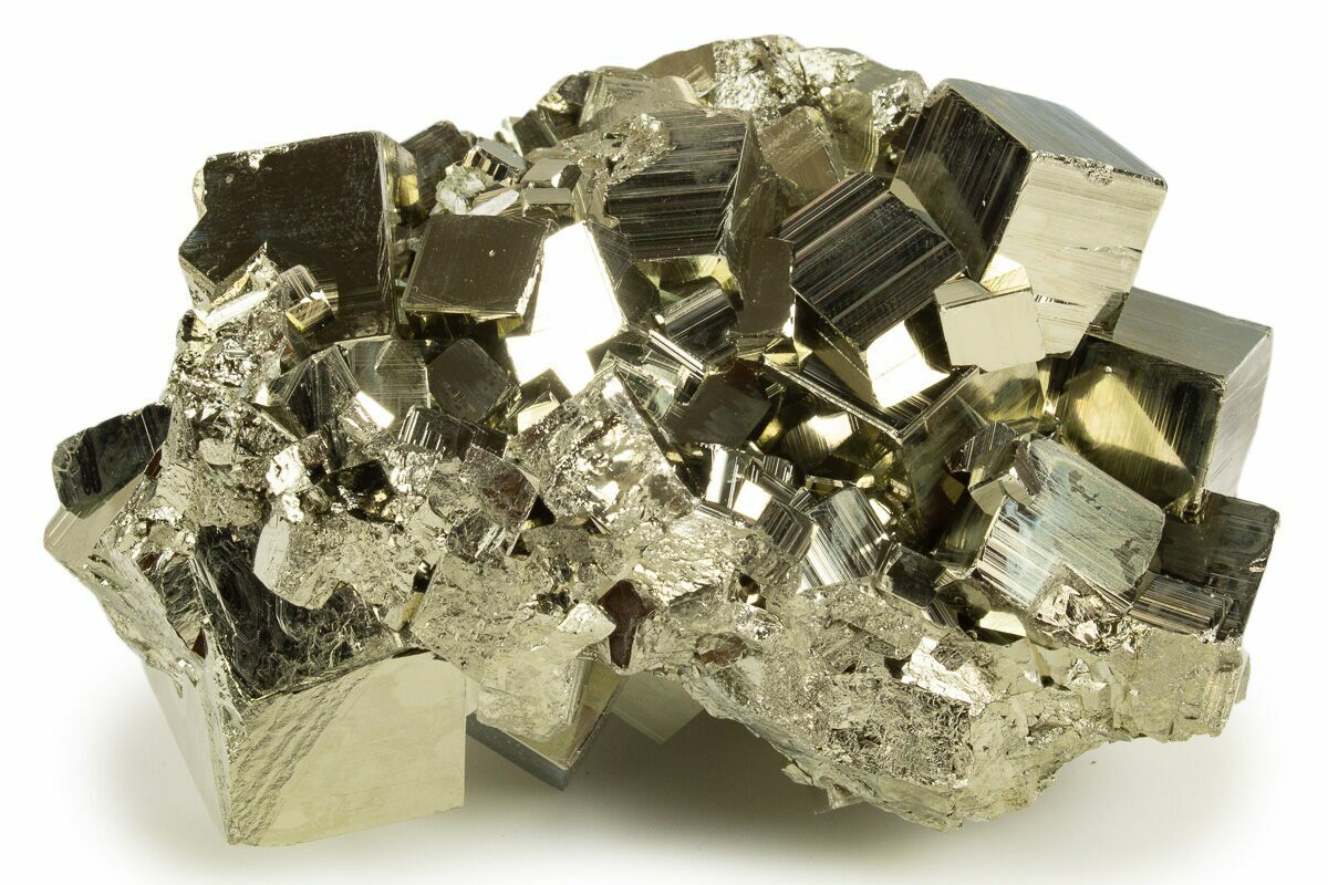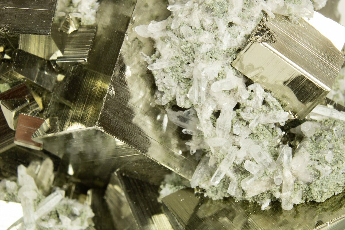 This is a stunning cluster of lustrous, striated cubic pyrite crystals that formed in association with quartz crystals, collected from the Huanzala Mine in Peru. The entire specimen measures 3.7" wide.