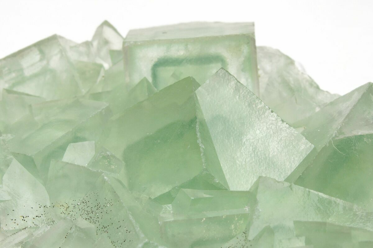 This is an aggregation of exceptionally beautiful cubic fluorite crystals with light-green coloration. Each crystal contains an internal "phantom" growth zone with deep-green coloration. It comes out of the Hunan Province of China, a region known for its stunning fluorite formations. The crystals are in excellent condition with only some minor chipping to edges, and typical damage along the periphery and underside of the specimen where it was removed from the pocket.
