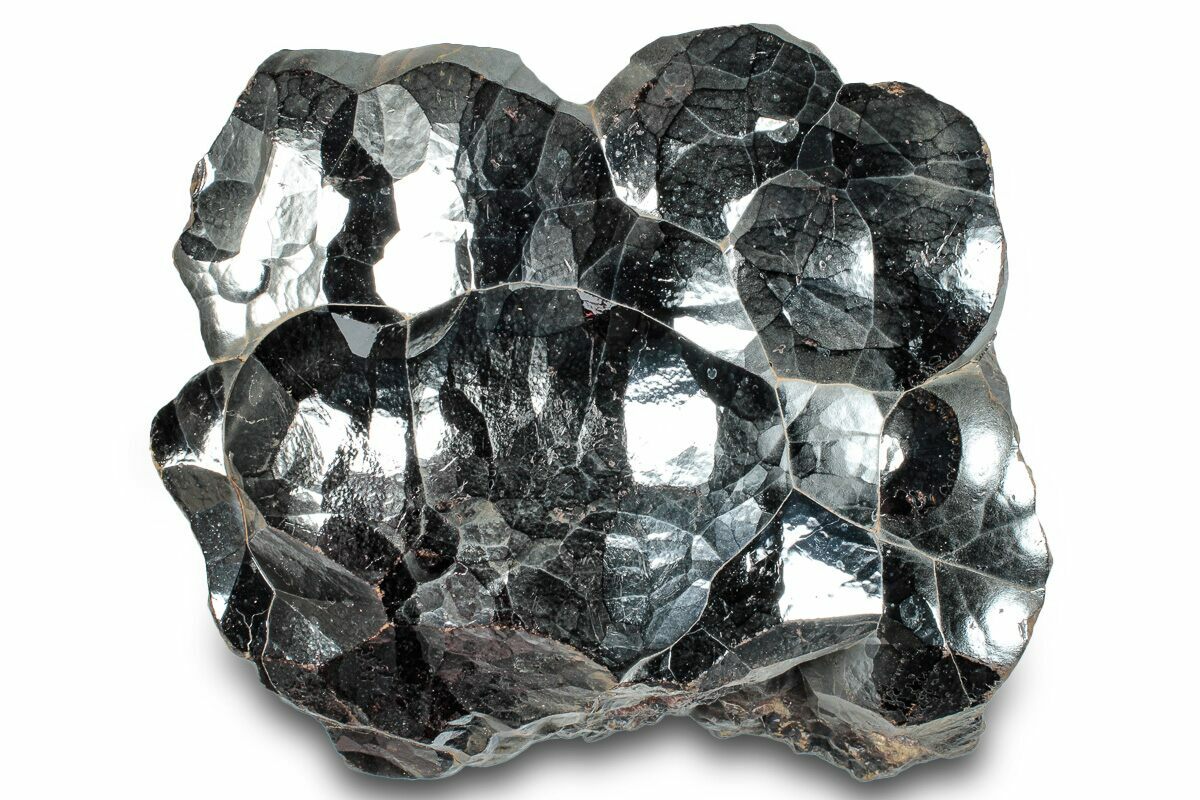 This is a shiny, metallic specimen of kidney ore (botryoidal hematite) from the Safi Province of Morocco.