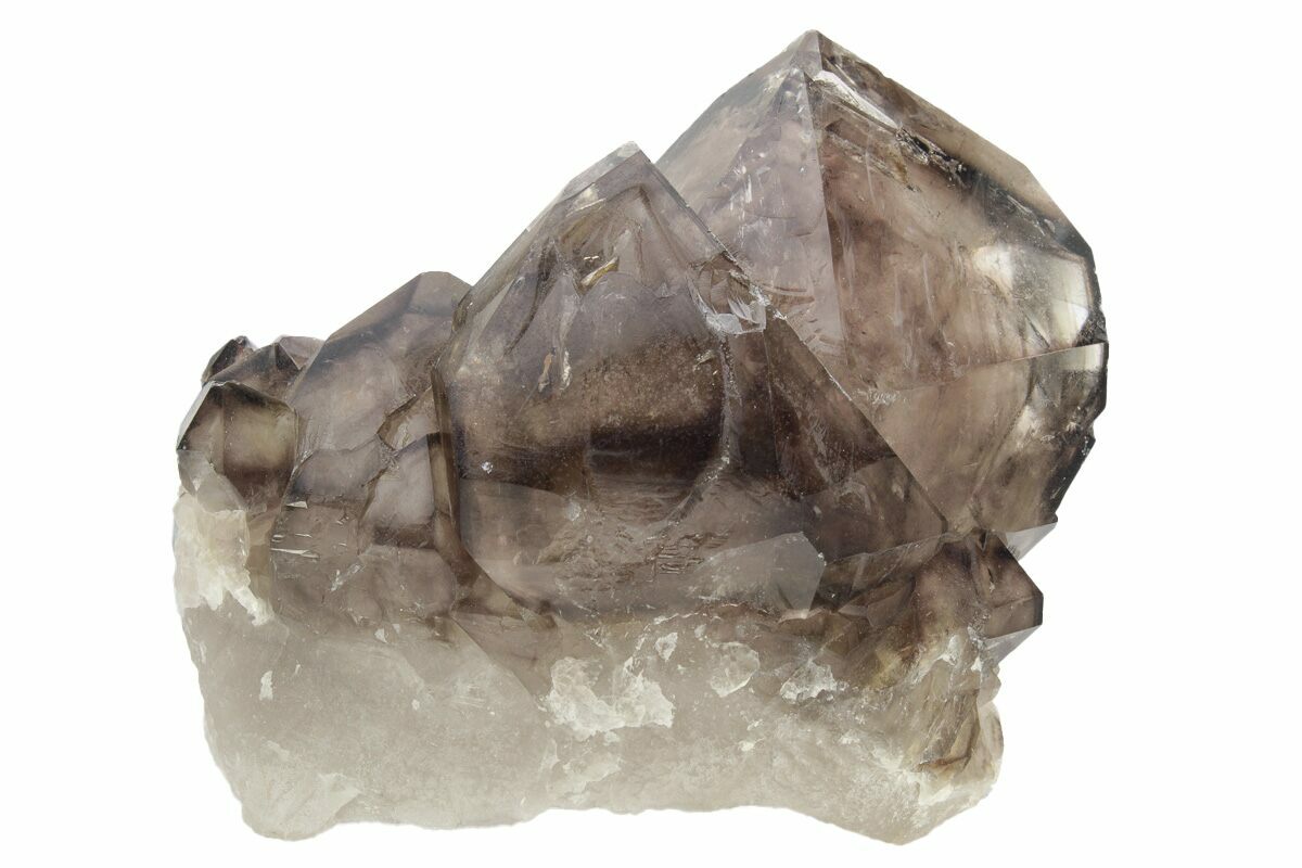 This is a natural smoky quartz crystal cluster from Minas Gerais, Brazil. This type of smoky quartz is commonly marketed as "smoky elestial quartz", or in some cases "jacaré" (Portuguese word for alligator) quartz for some specimens' resemblance to alligator skin. It features a gorgeous glassy luster and stunning transparency.