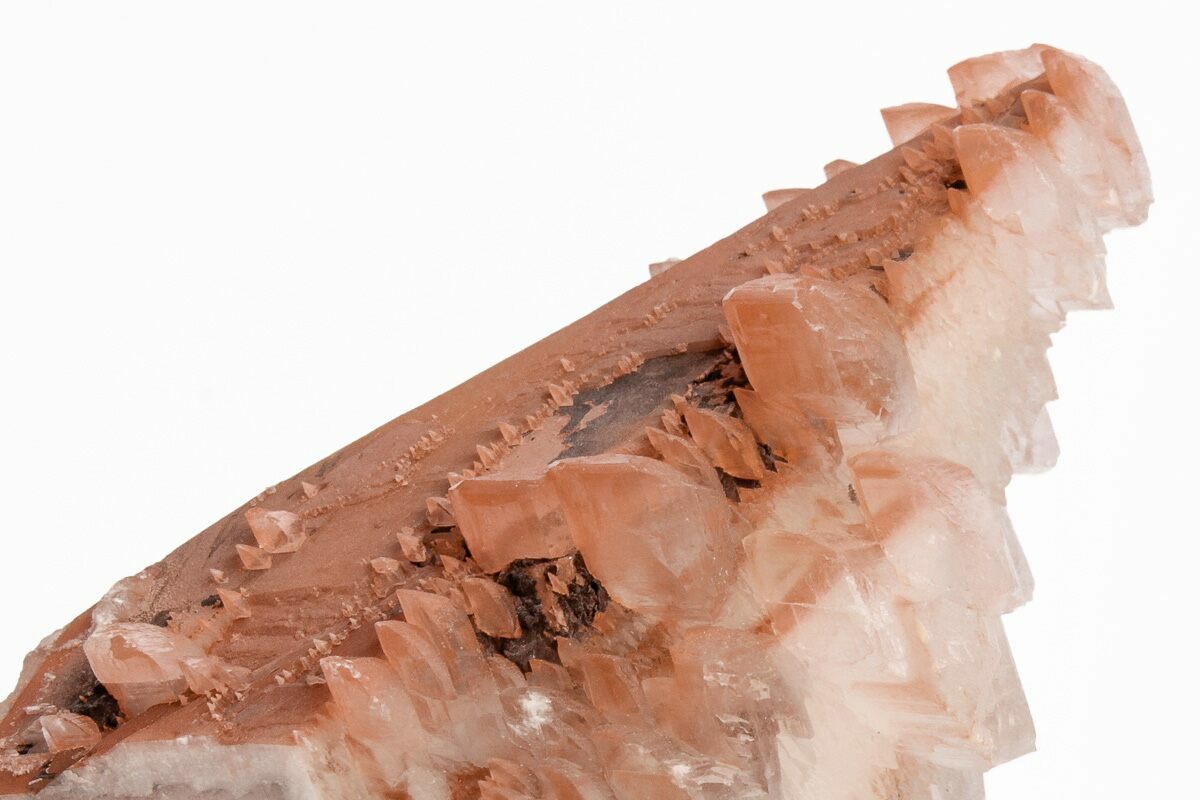 This is a beautiful cluster of hematite included, "pagoda style" calcite crystals that formed after a large, hematite encrusted dogtooth (scalenohedral) calcite crystal. This specimen was collected from the Fengjiashan Mine in Hubei, China. Under short-wave ultraviolet, the colorless portions of the calcite react by fluorescing orange in color.