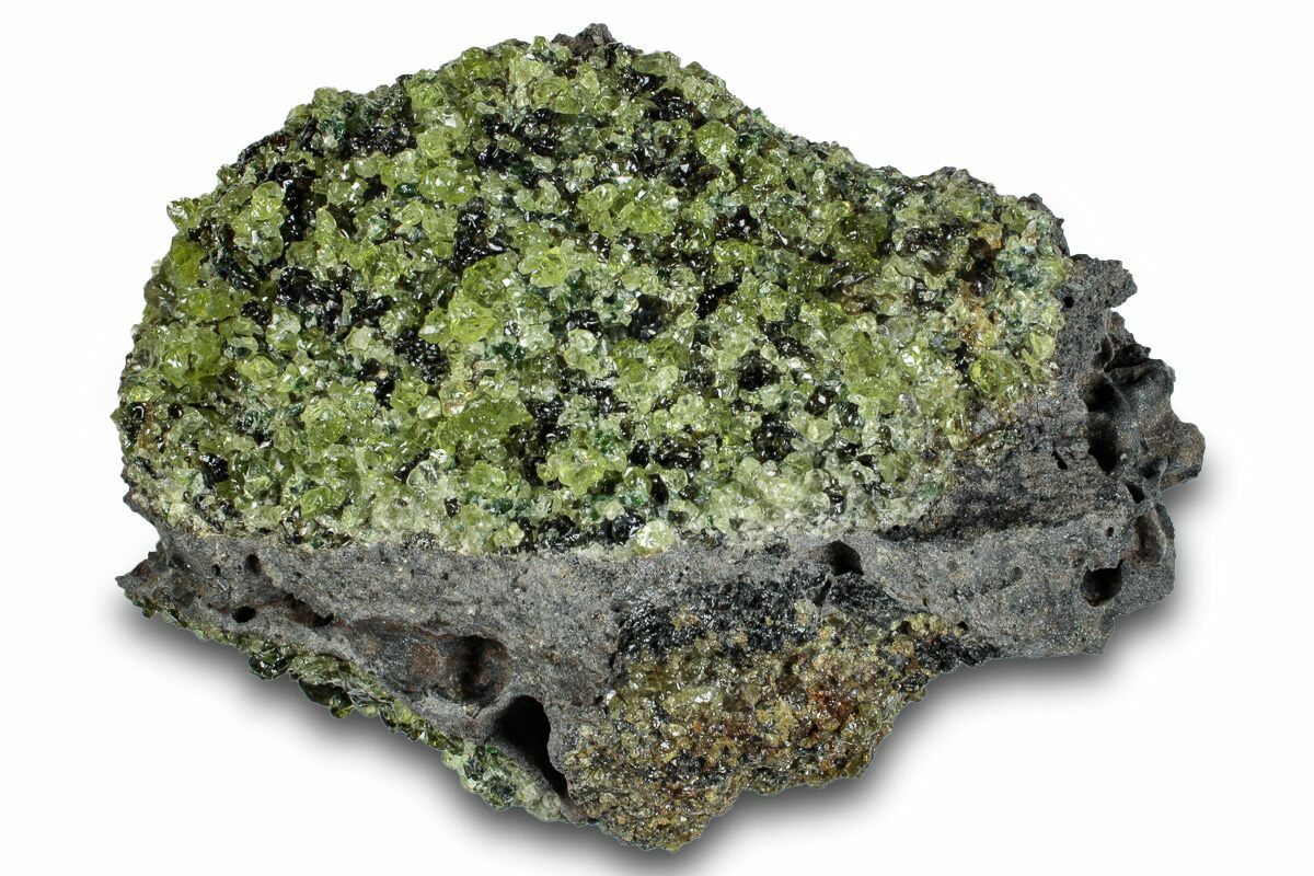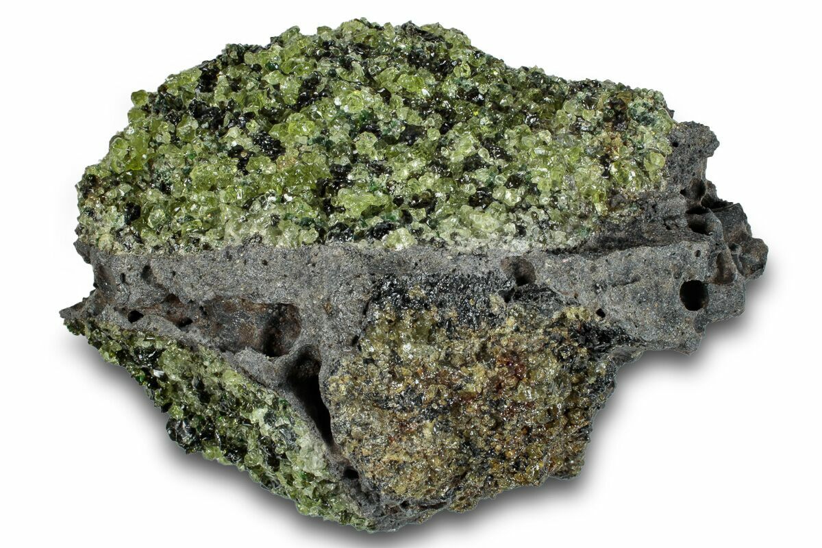 This is a 3.7" wide specimen of peridot crystals in basalt, containing both light and dark green olivine peridot, collected from the San Carlos Apache Reservation in Arizona.