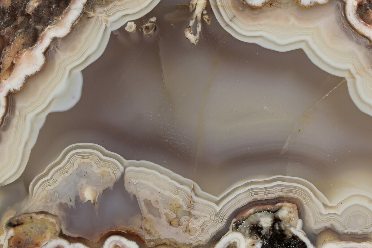 Agate is a variety of microcrystalline quartz (chalcedony) that displays translucence and, in some cases, banding. Agate primarily forms when silica-rich fluids fill pockets within rocks and/or fossils, depositing the silica along the walls of the rock. This process can result in banding patterns, as the compositions and impurities of these depositing fluids change over time. These banding patterns can either form as flat layers, creating linear patterns known as waterline agate, or as rounded layers, forming more common ring-like patterns. These patterns depend on the surfaces available for deposition.