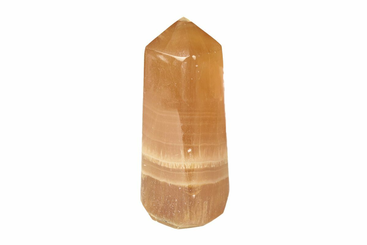 This is a 3.7" tall obelisk made from banded honey calcite. The entire specimen has been polished to a glossy finish with a flat cut base.