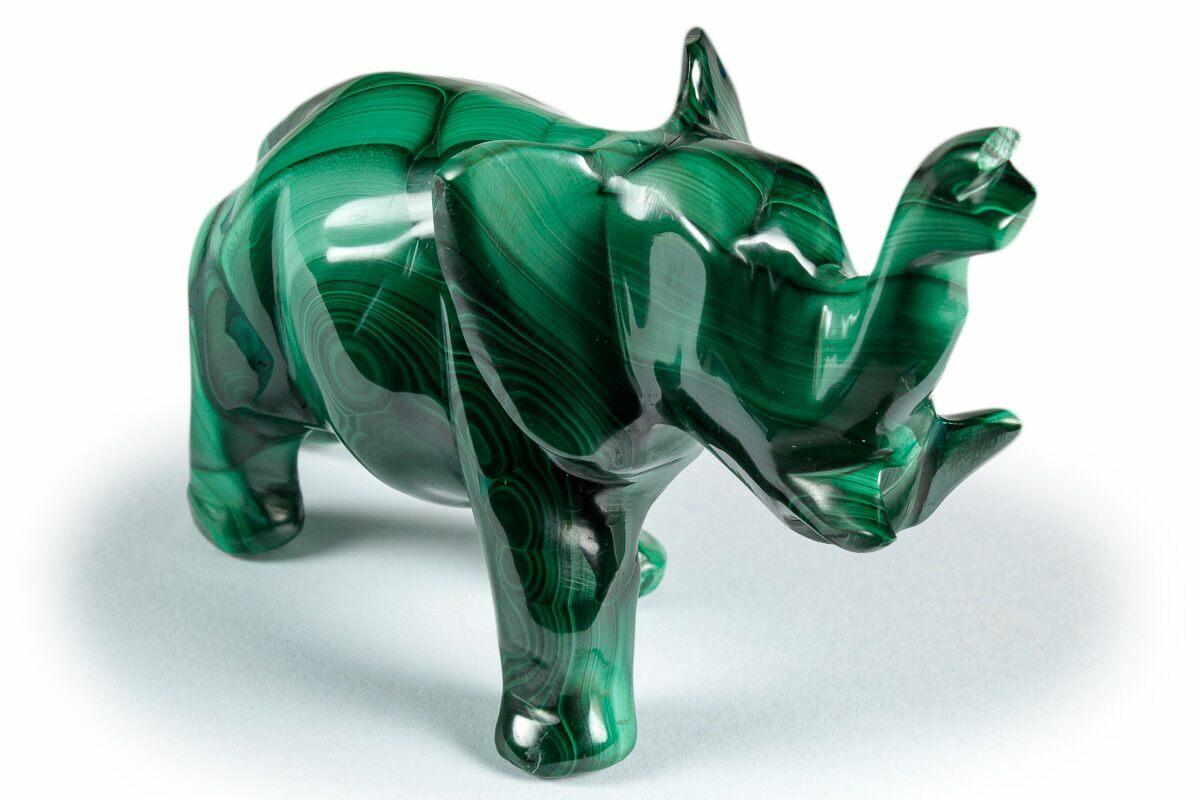 Trumpeting out of the grassland and into your home is this exquisitely carved malachite elephant from the Democratic Republic of the Congo. This is a sturdy piece that highlights the beauty of malachite with a nice, even polish. From rough mineral to polished piece, the malachite was worked by an expert craftsman to produce a seamless statue pachyderm ready for display on the shelf or in the office.