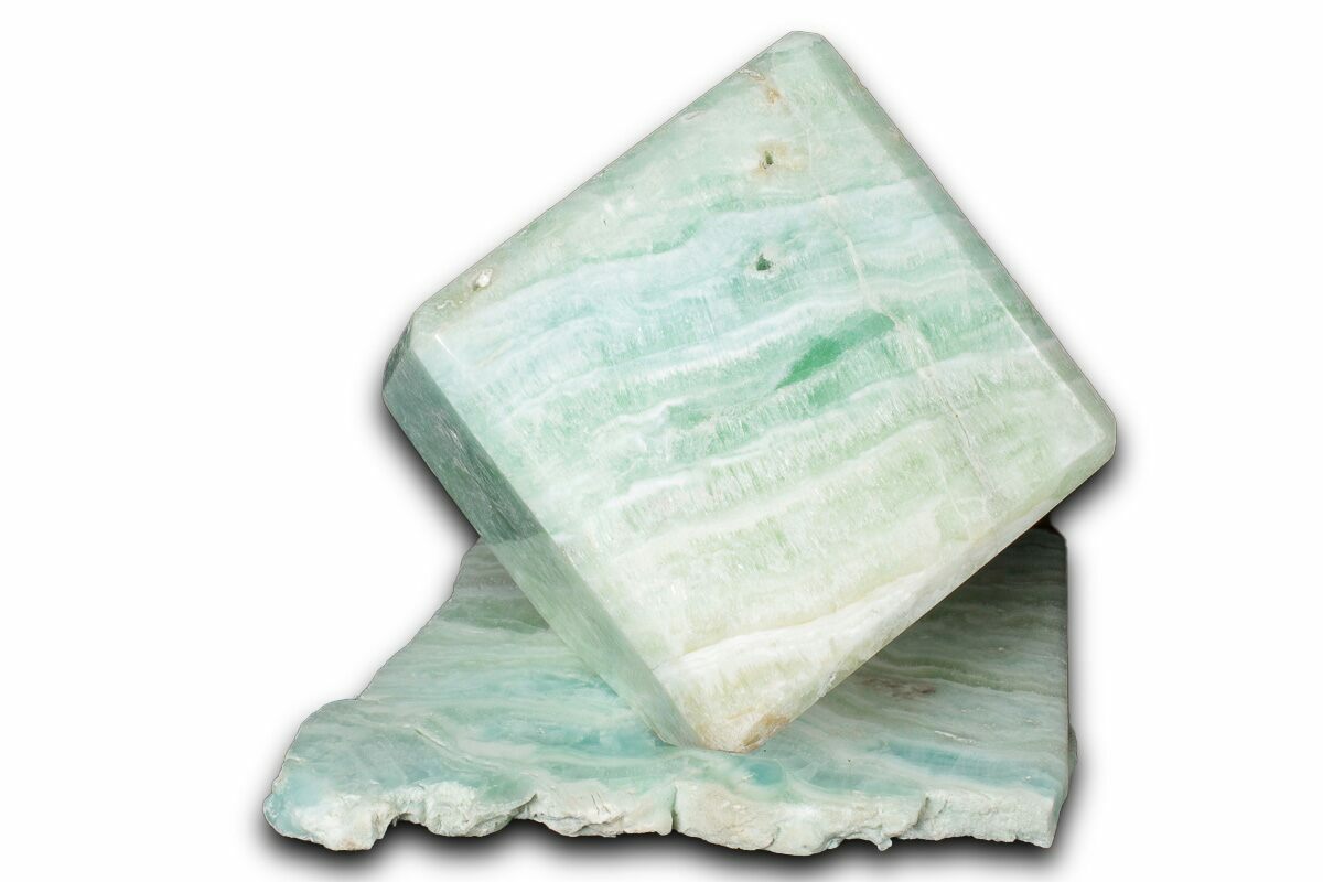 This is a 2.35" wide, polished cube of blue Caribbean calcite collected from the Balochistan Province along the border of Pakistan and Afghanistan. It has been cut into the shape of a cube with beveled edges and polished to a glossy finish. One corner has been cut flat for an aesthetic "floating" presentation on the accompanied Caribbean calcite base.