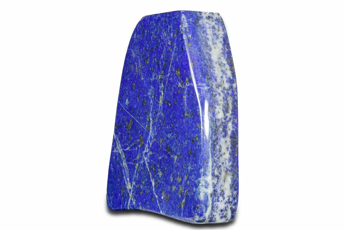 This is a 3.7" wide, polished piece of lapis lazuli with streaks of sparkling pyrite running through it. This vibrant blue stone was mined from northern Pakistan.