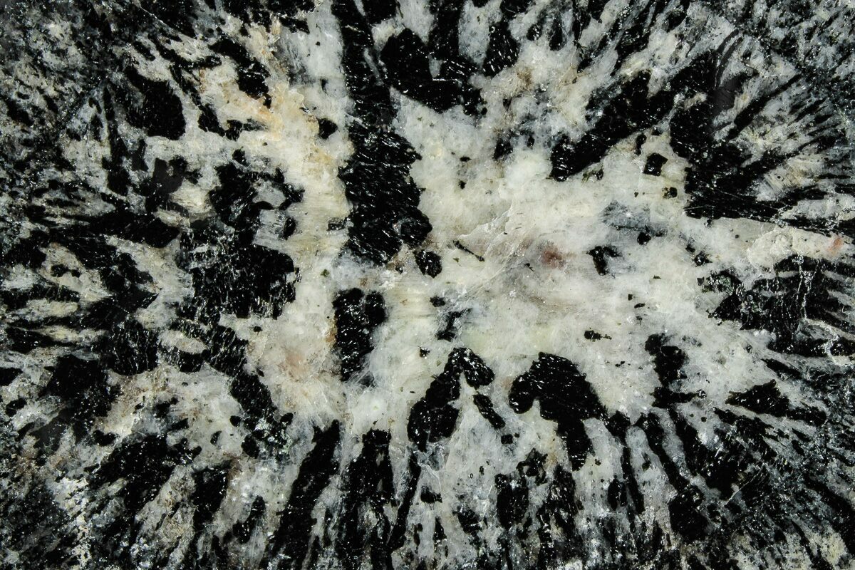 Orbicular granite occurs only rarely, and their occurrences are often very small. Most deposits are found in Finland, but notable deposits can also be found in Chile and Australia. This material is from the Australian Boogardie Orbicular Granite deposit, near Mount Magnet in Western Australia. It is characterized by light andesine with darker hornblende and biotite radiating from plagioclase or hornblende cores. This orbicular granite is touted as the oldest in the world, at almost 2.7 billion years!