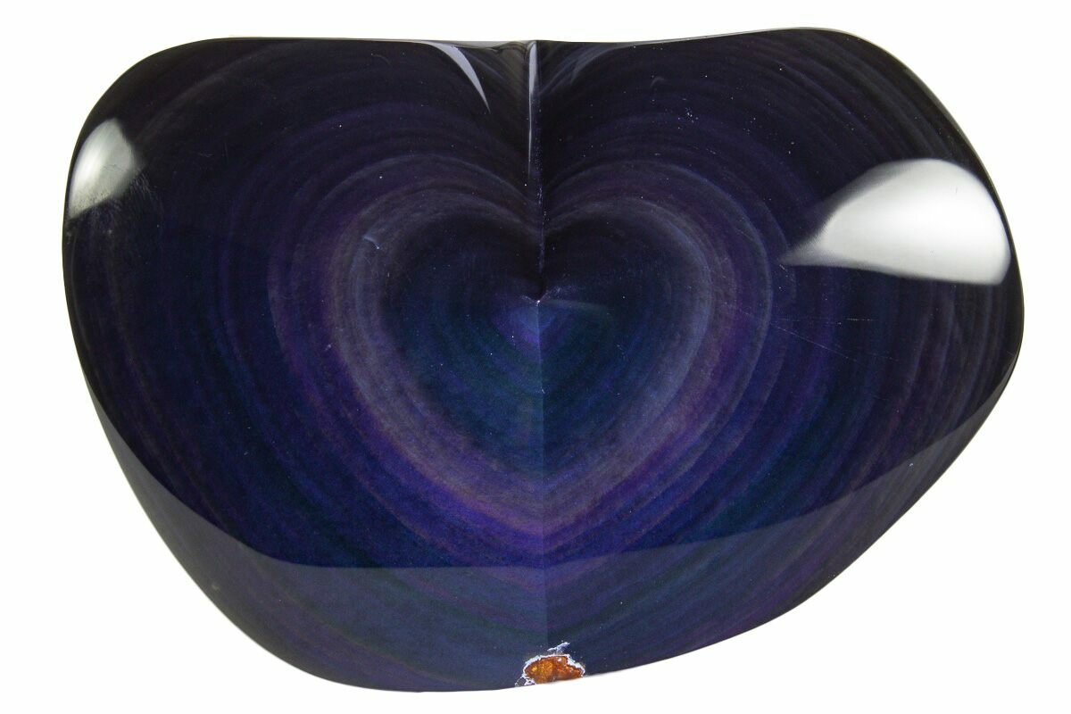 This is a 3.7" wide rainbow obsidian specimen. This interesting stone is mined from La Revoltosa Mine near San Andreas, Jalisco, Mexico. The obsidian exhibits a colorful chatoyant effect that changes when viewed under a light source from different angles. The specific shaping and polishing of the obsidian gives the rainbow layers their heart shape.