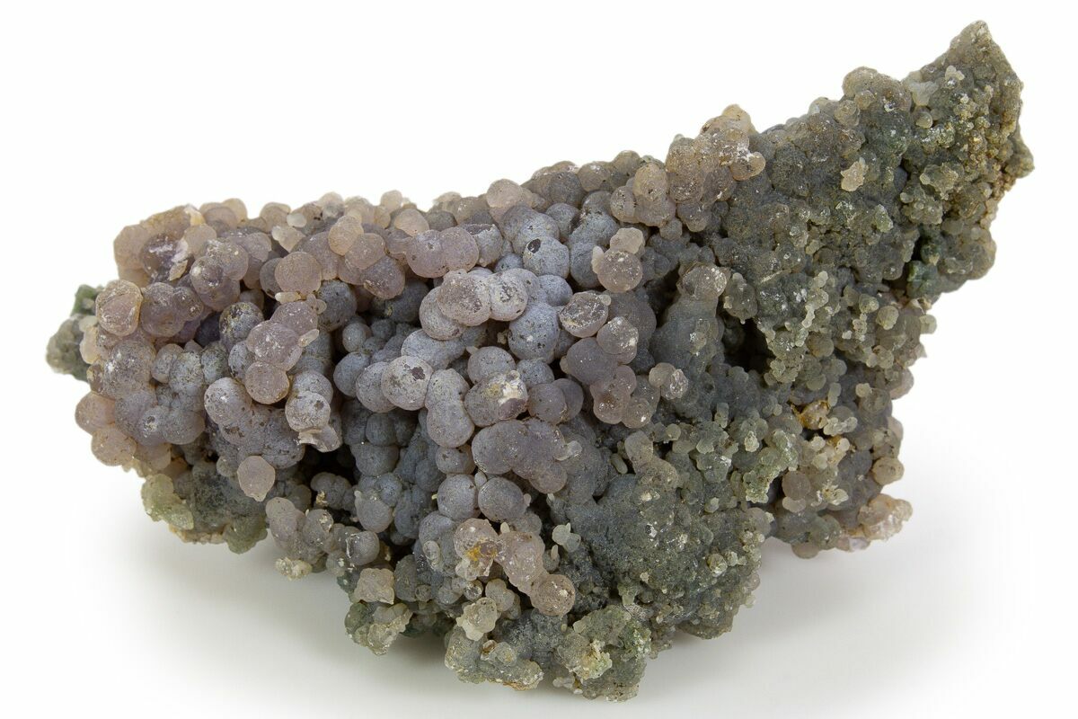 These formations were created over millions of years as silica-rich fluids filled voids and crevices in volcanic rock. As the fluids cooled, they precipitated tiny quartz crystals, which slowly grew in layers to create the nodules we see today. Its mineral composition and appearance set it apart from traditional agates, and it would be most technically correct to call it a "amethystine botryoidal chalcedony". As a collectible mineral, it’s relatively durable but should be kept out of direct sunlight to prevent color fading.