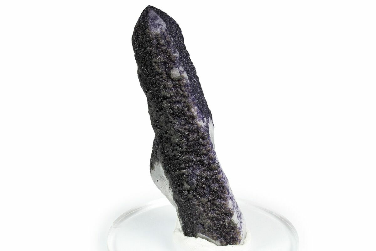 This fascinating specimen represents a new find from the renowned Huanggang Mines of Inner Mongolia. It features a thin layer of purple fluorite overlying a 3.7" long quartz crystal. The specimen is accompanied by an acrylic display base and mineral tack.