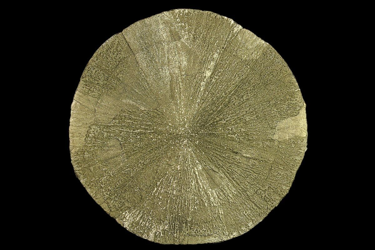 Pyrite suns or pyrite dollars are an unusual pyrite formation: striations radiate out from the center like rays of the sun. They are found in narrow, compacted seams of slate interbedded in the 300 million-year-old coal deposits near Sparta, Illinois. They are recovered as a byproduct of local coal mining operations, but are increasingly difficult to source as the coal mines in Illinois shut down one by one.