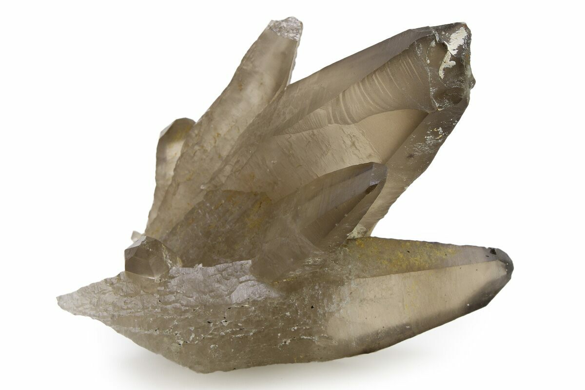 This is an interesting, 3.7" wide cluster of smoky quartz crystals collected from Erongo Region of Namibia. Under shortwave UV light, a vibrant green inclusion of hyalite opal can be found near the base of the cluster. The reaction to shortwave UV is a result of trace uranyl ions.