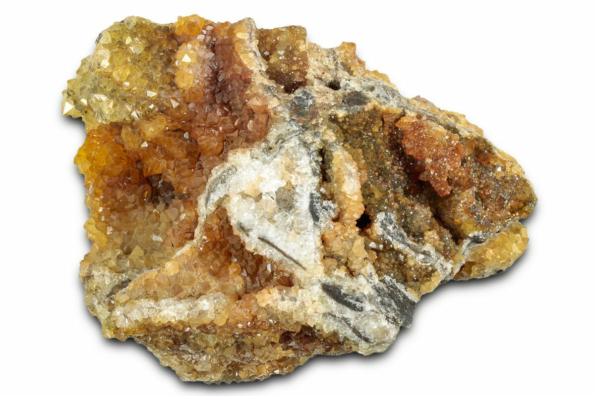 This is a new mineral find out of Turkey. It's a 3.7" wide section of matrix with pockets encrusted in natural citrine quartz crystals. The most likely location of collection is the Göynük mine in the Kütahya Province of Turkey, however we're not certain about this.