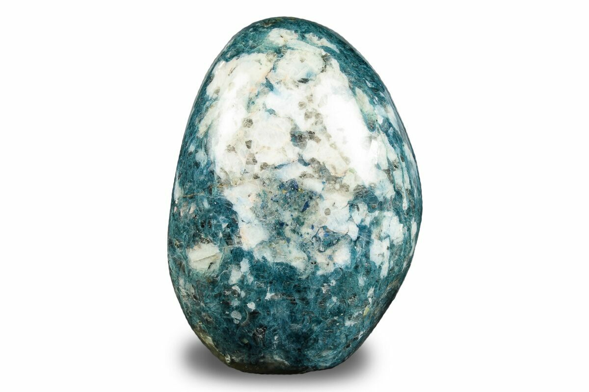 This is a 3.75" tall, polished piece of fibrous, blue dumortierite within quartz. Under magnification, the small fibrous dumortierite crystal aggregations can be seen in great detail within the quartz. The base of the stone has been cut flat so that it displays nicely on a hard surface. In addition to being polished it has also been coated in an epoxy sealant