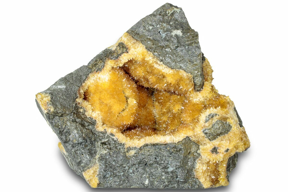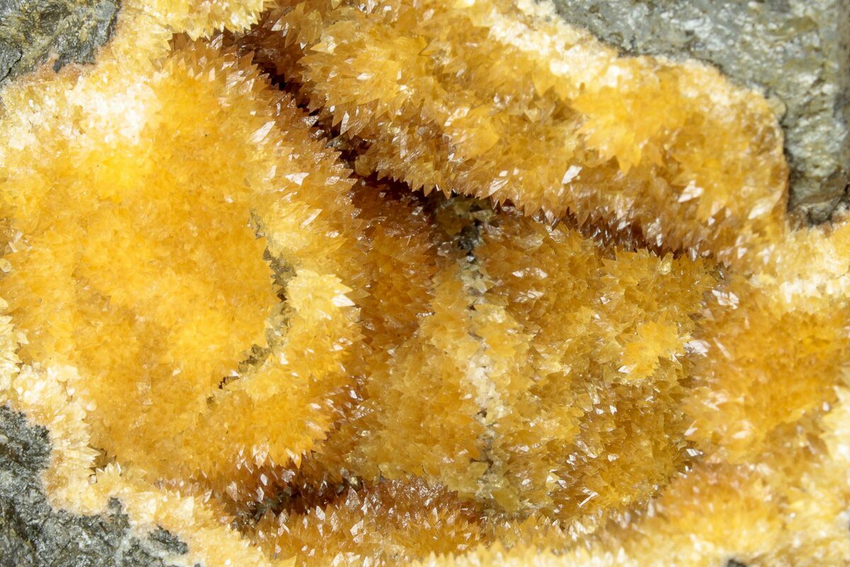 This is a 3.8" wide cluster of sharp orange calcite crystals on basalt. This comes from the Grabiszyce Basalt Quarry in the Luban District of Poland. Under shortwave UV, these crystals fluoresce a white-orange color.