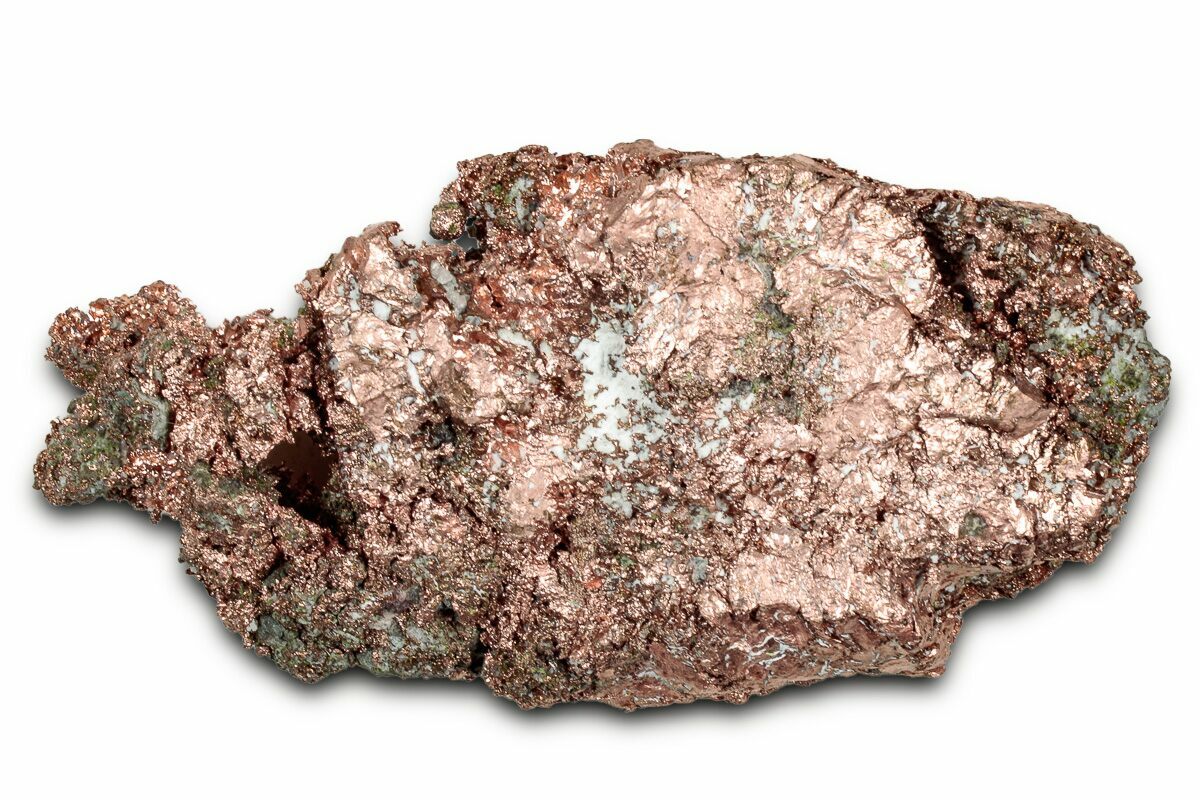 Native copper occurs rarely as isometric cubic and octahedral crystals, but more typically as irregular masses and fracture fillings. It has a reddish, orangish, and/or brownish color on fresh surfaces, but typically is weathered and coated with a green tarnish of copper carbonate.