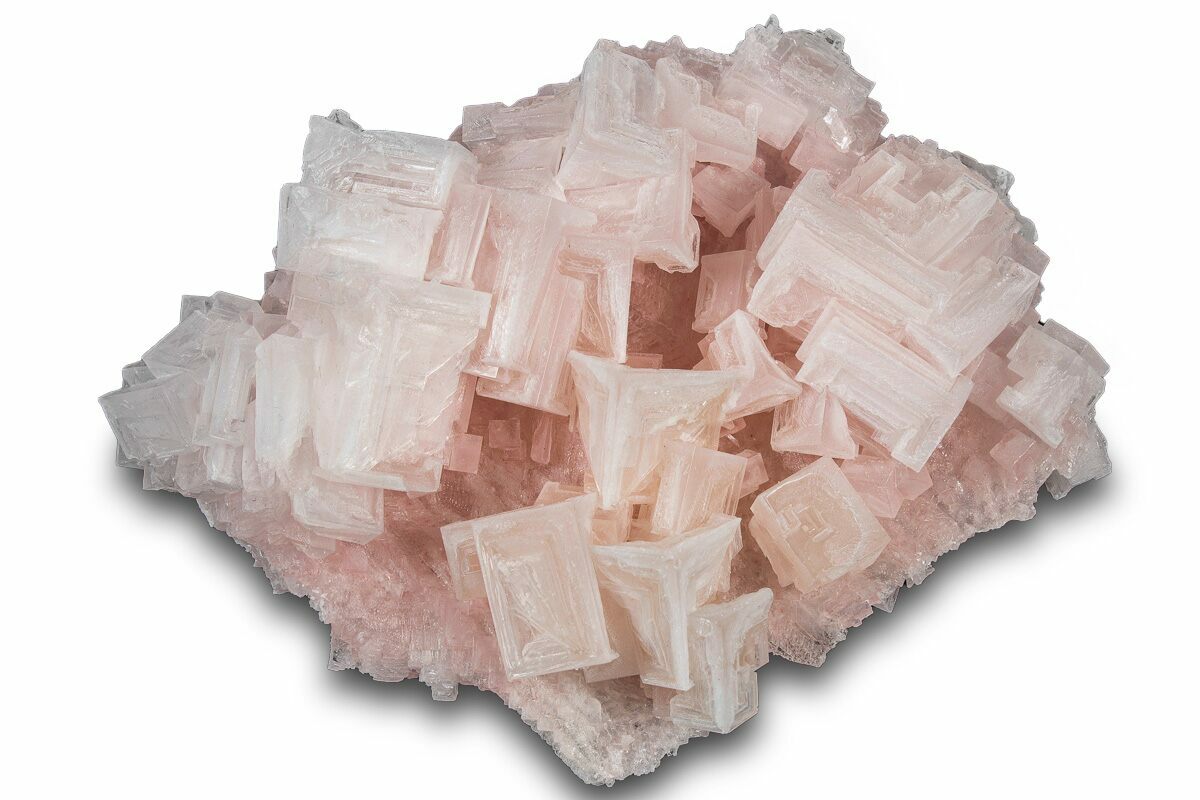 Halite crystals from Trona, California are prized for their striking cubic formations and delicate pastel colors. Formed in the arid environment of Searles Lake, these crystals develop as brine-rich waters evaporate, leaving behind layers of salt and other evaporite minerals. The halite here often exhibits a translucent to transparent quality with hues ranging from soft pink and lavender to pale orange, depending on mineral impurities and lighting conditions. Some specimens display a skeletal or "hopper" crystal growth, where the edges of the cubes grow faster than the centers, creating intricate, hollowed patterns. Due to their solubility in water, Trona halite crystals must be carefully stored to preserve their natural beauty. These ephemeral, geometric wonders are a favorite among mineral collectors for their unique desert origin and delicate charm.