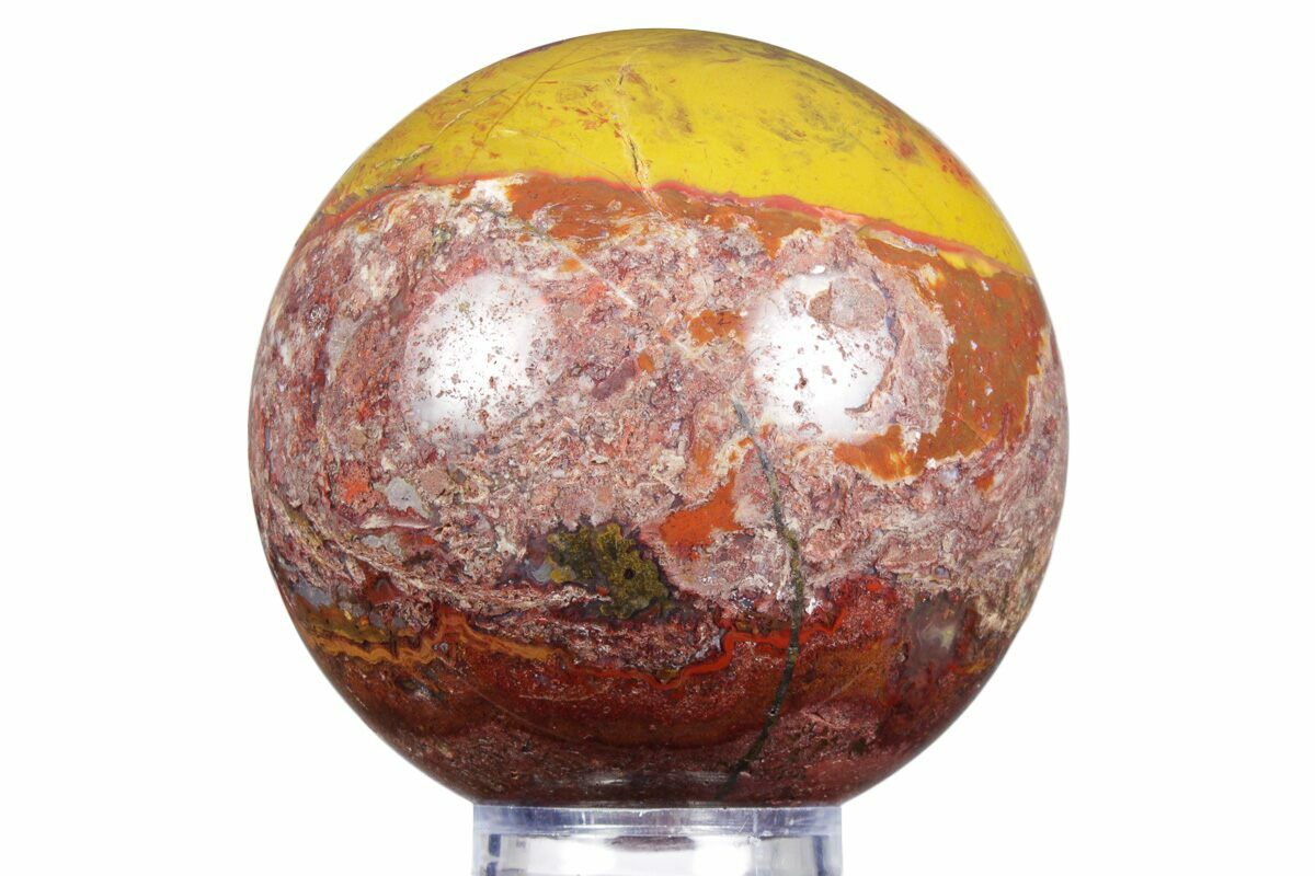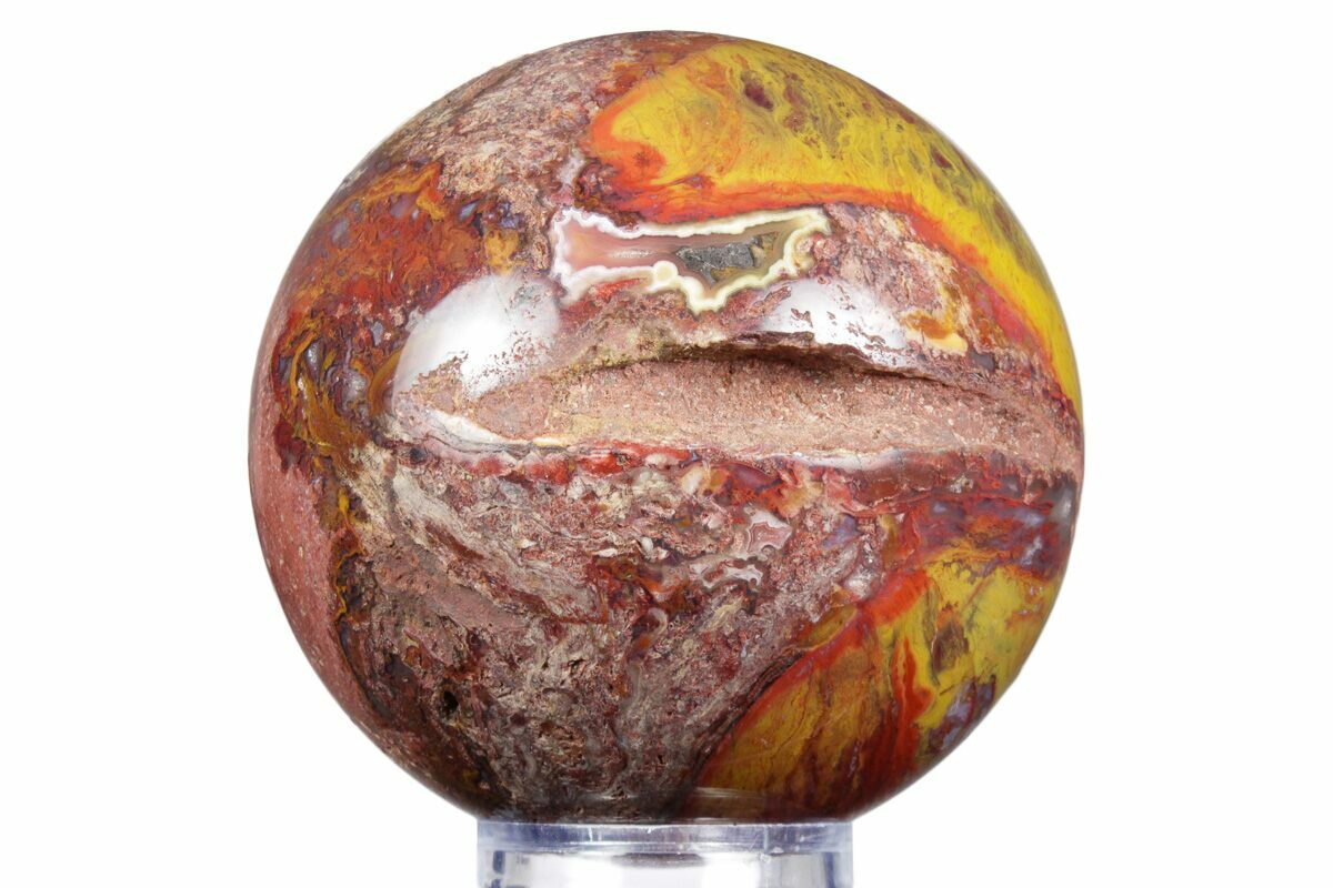 This striking Inferno Agate sphere from Mexico is a bold and fiery display of color and natural artistry, measuring 3.8" in diameter. It features dramatic swirls of deep crimson, burnt orange, and golden yellow, blending together in fluid, flame-like patterns that give the stone its “inferno” character.
