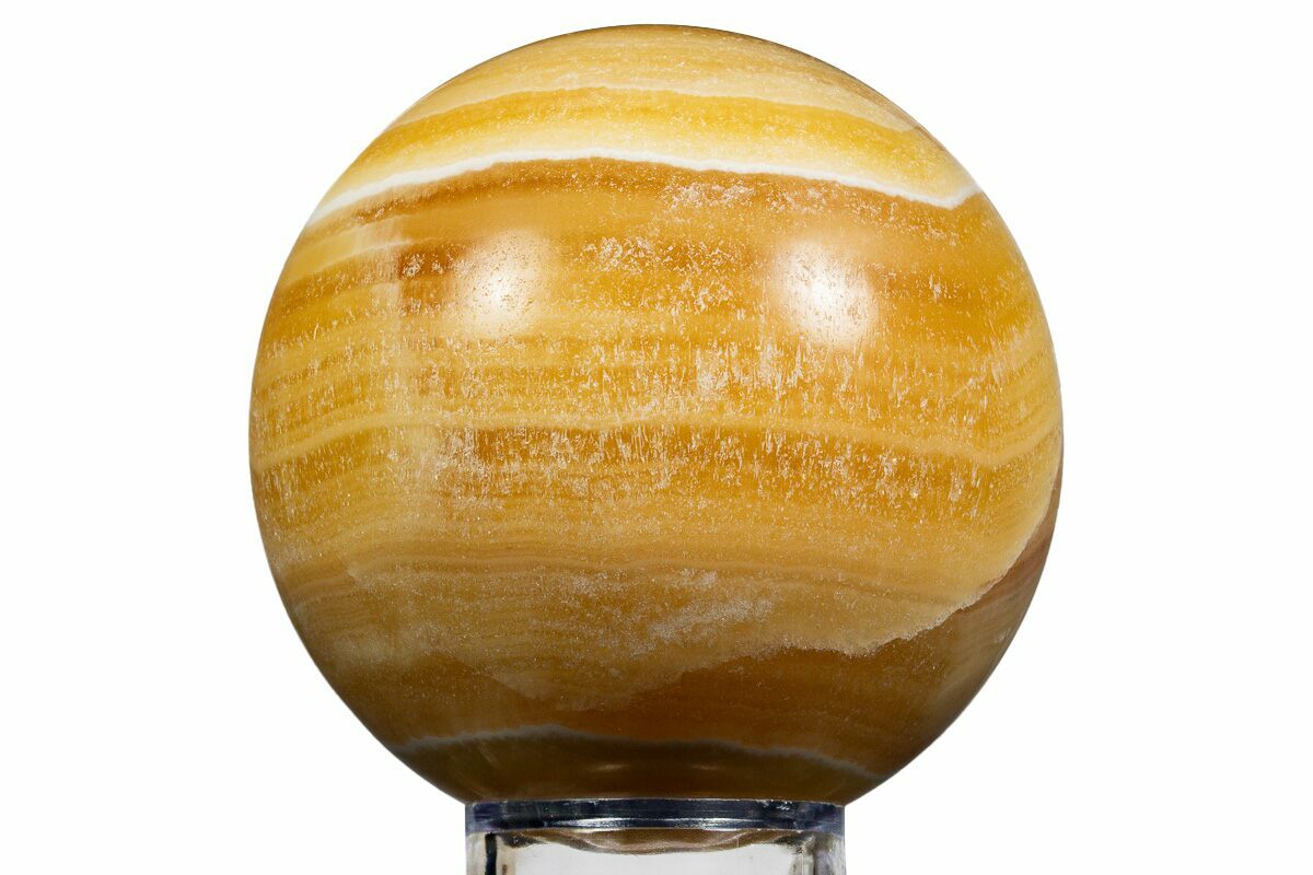 This is a vibrant, 3.8" wide polished sphere of orange calcite from Nuevo León, Mexico. The sphere has been expertly shaped and polished to a glossy finish, allowing its swirling bands of tangerine, honey, and soft golden hues to glow beautifully in the light. Its translucency gives it a soft internal radiance.