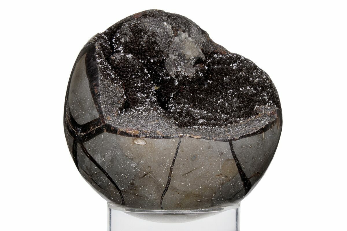 This is a gorgeous, 3.8" wide, polished septarian geode collected in the Betsiboka Region of Madagascar. The hollow cavity is full of shimmering, black calcite crystals. It is a hollow septarian nodule, which has been polished into a round, sphere shape, and the natural cracked pattern of the septarian gives it the appearance of a dragon's egg.
