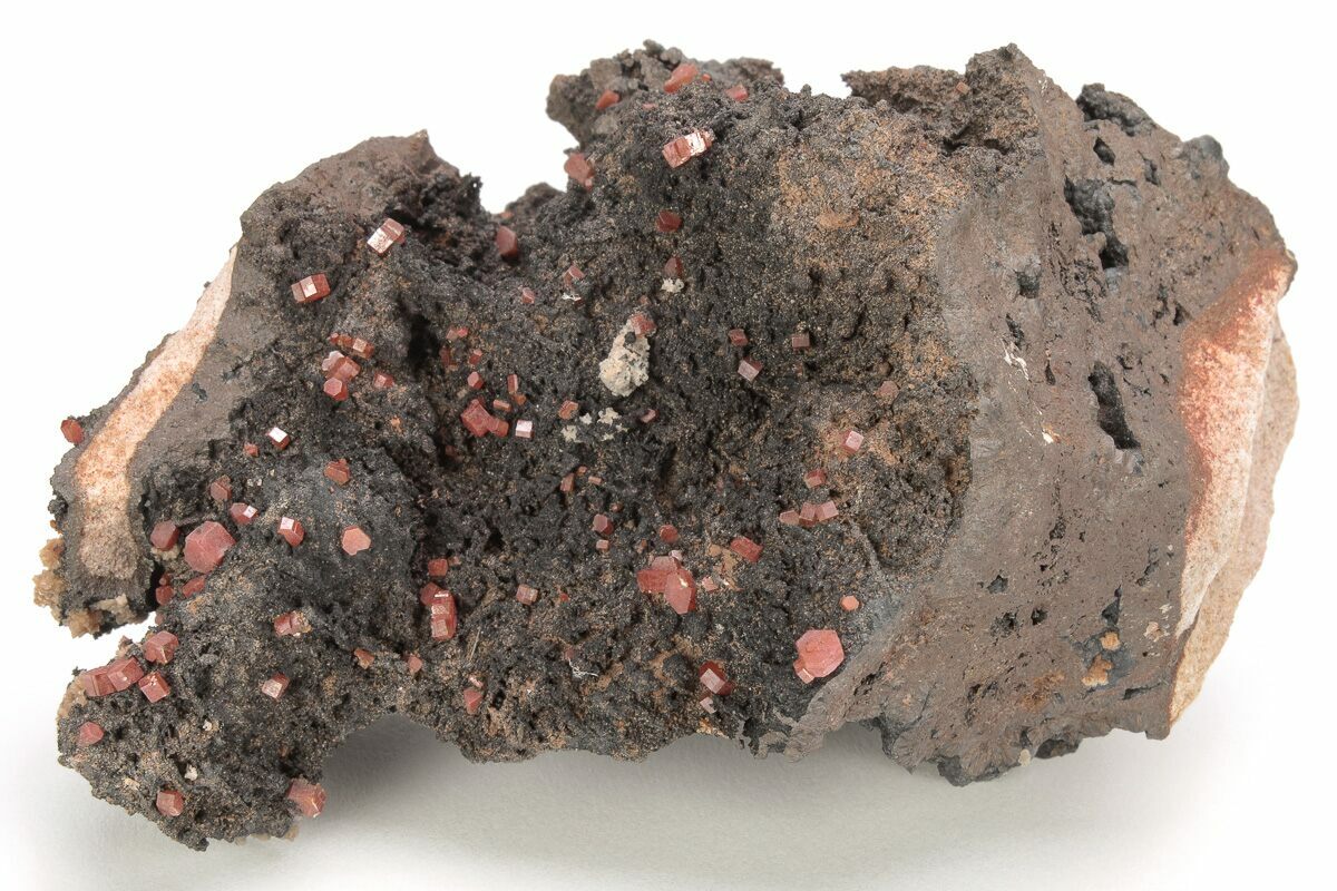 This specimen contains lustrous red Vanadinite crystals, naturally displayed on an iron-manganese oxide matrix. Both iron rich, and manganese rich matrix' can be seen on opposite sides of this specimen.