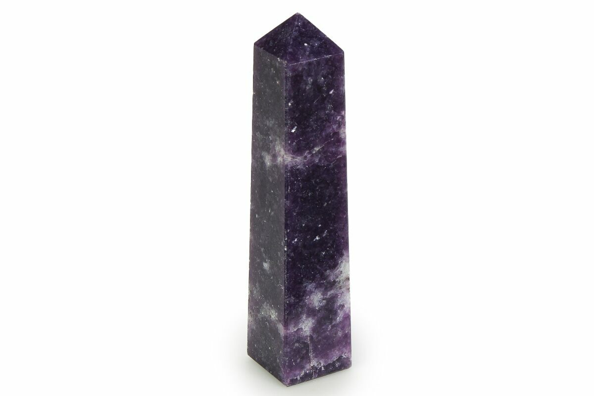This is a 3.8" tall, polished tower crafted from richly colored, dark-purple lepidolite. Its naturally sparkly, mica-rich surface catches the light beautifully, creating a shimmering display from every angle. A striking piece with great texture and color, perfect for adding a vibrant mineral accent to any collection.