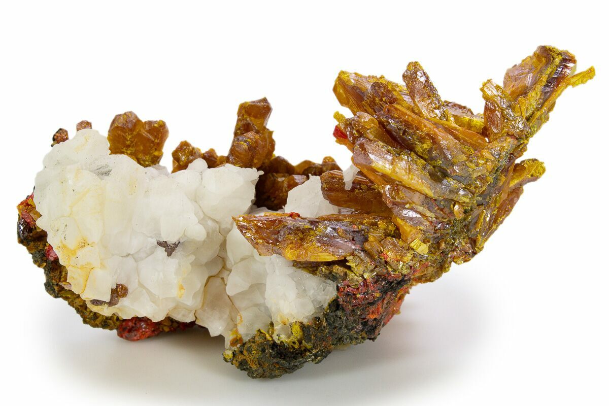 This exciting mineral formation comes out of the Shimen Deposit in Hunan, China. It features vibrant yellow and red-orange orpiment crystals that formed in association with calcite.