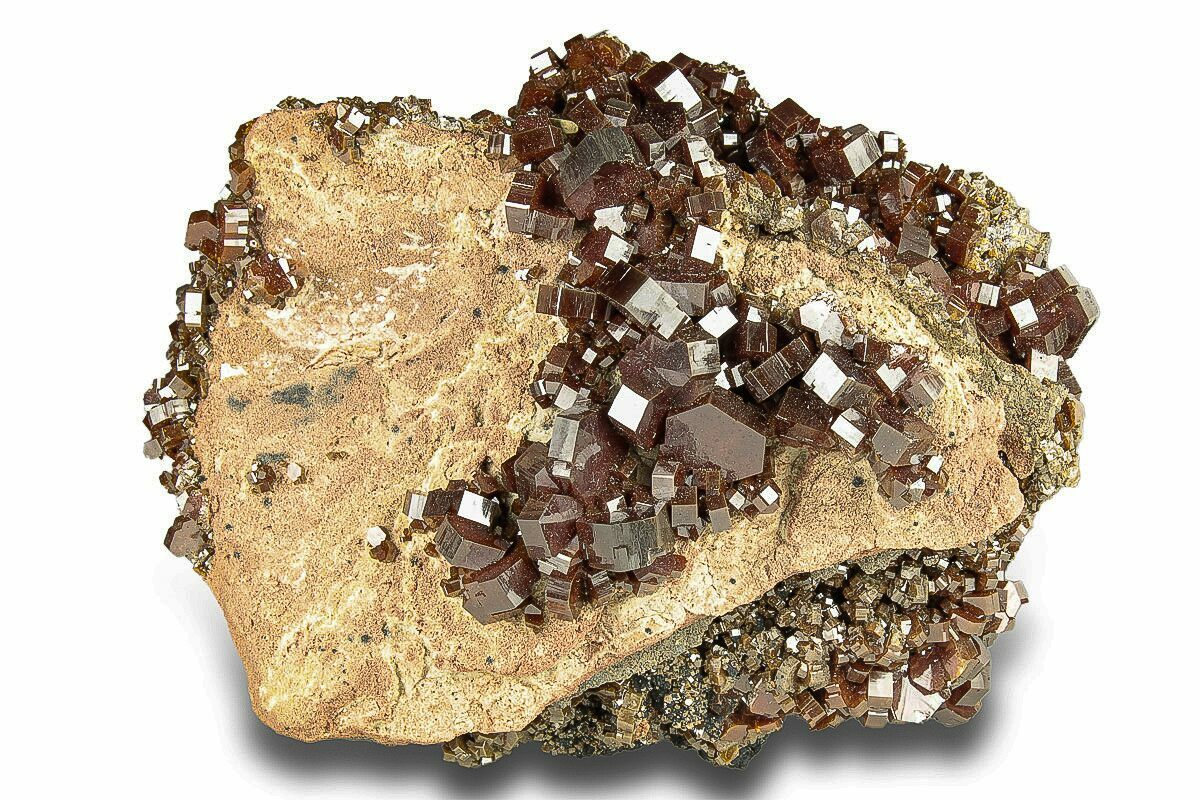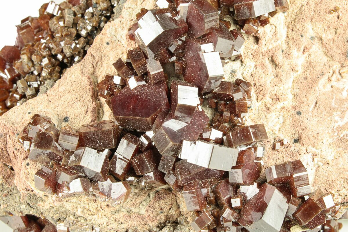 Vanadinite from Morocco is world-famous for producing some of the finest red crystal specimens on the planet. In the arid hills surrounding Mibladen and Taouz, vanadinite forms as vibrant clusters of hexagonal prisms, often with a deep crimson to orange-red color that seems to glow against the pale desert matrix. These crystals typically develop in dense groups, coating barite blades or covering weathered limestone with dazzling, glassy faces and sharp geometric symmetry. The dryness of the region and the slow oxidation of ancient lead deposits create the perfect geochemical environment for vanadinite to grow with exceptional clarity, luster, and intensity of color. Moroccan vanadinite is highly prized by collectors for its bold aesthetics, architectural crystal formations, and the consistent quality that has made these localities the global benchmark for the species.