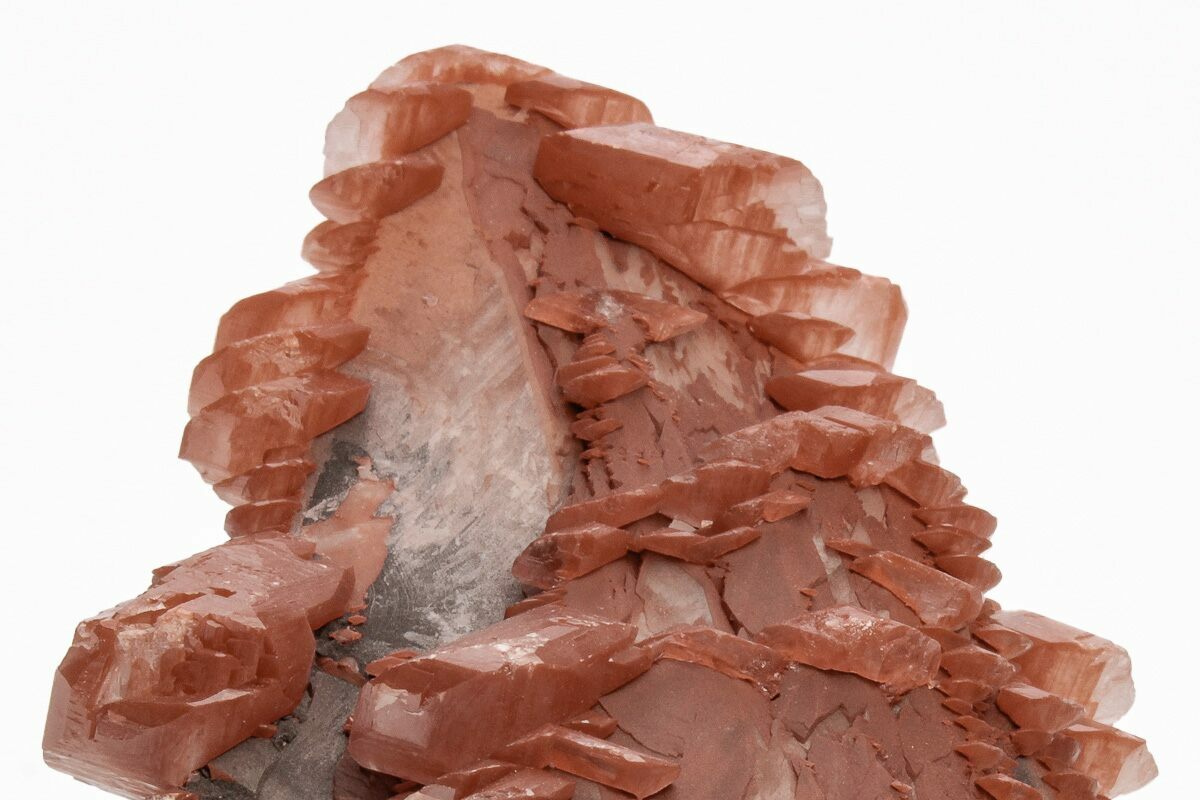This is a beautiful cluster of hematite included, "pagoda style" calcite crystals that formed after a large, hematite encrusted dogtooth (scalenohedral) calcite crystal. This specimen was collected from the Fengjiashan Mine in Hubei, China. Under short-wave ultraviolet, the colorless portions of the calcite react by fluorescing orange in color.